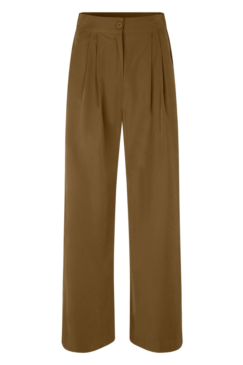 Et par cool bukser fra Modström er lige landet. Den fine farve er perfekt til efteråret og de andre mørkere farver der kommer. Der er elastik i taljen og foran lukkes de med en knap. Der er vide i benene og skrålommer i begge sider.