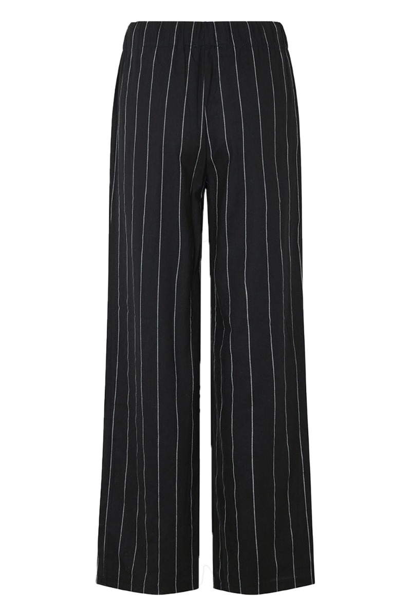 Sorte bukser fra Modström med hvide tynde striber. Bukserne er i en dejlig luftig hørkvalitet med en bred elastikkant i livet der kan snøres ind foran. De er løse i benene med et lige snit og har lommer i siden. Style med den matchende skjorte eller brug dem afslappet med en t-shirt.
