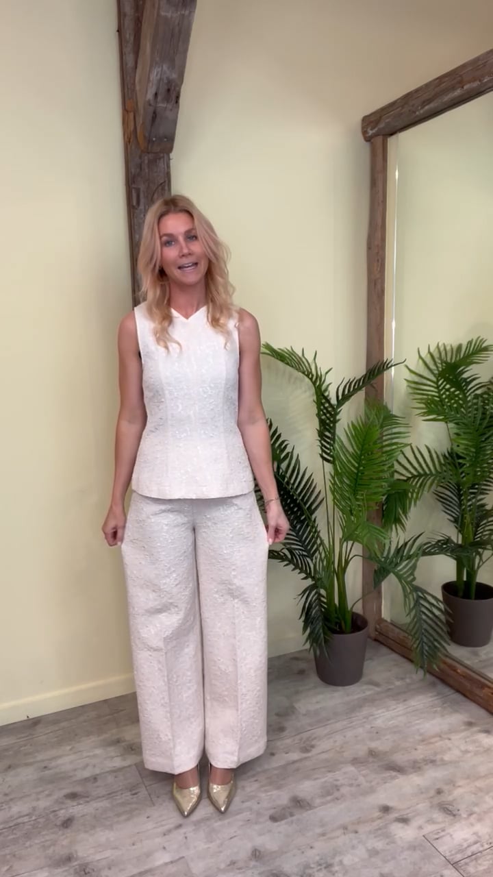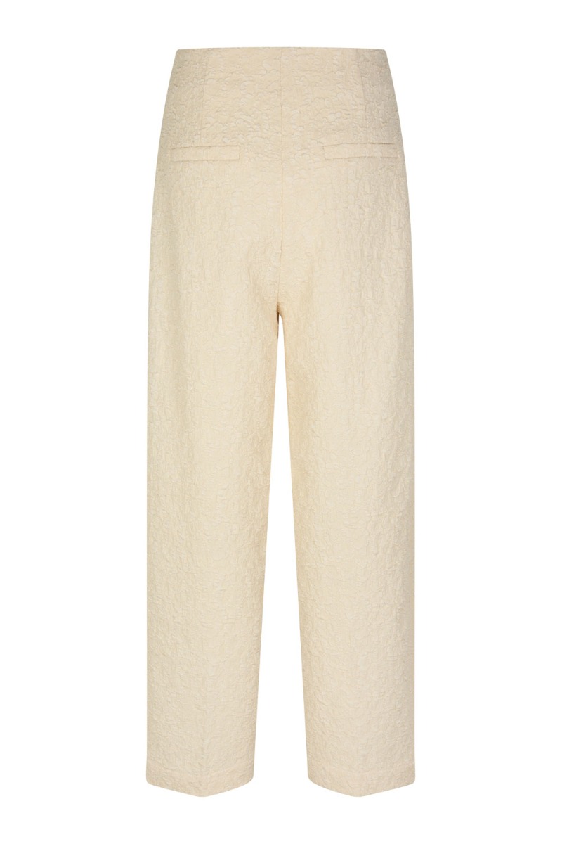 Et par fine bukser fra Modström er landet til denne sommer. De er med struktur i stoffet og i en dejlig let kvalitet. Der er vide i benene og de lukke siden med en skjult lynlås. De er en del af et sæt, så der findes en matchende top. Men bukserne kan sagtens bruges til en anden overdel.