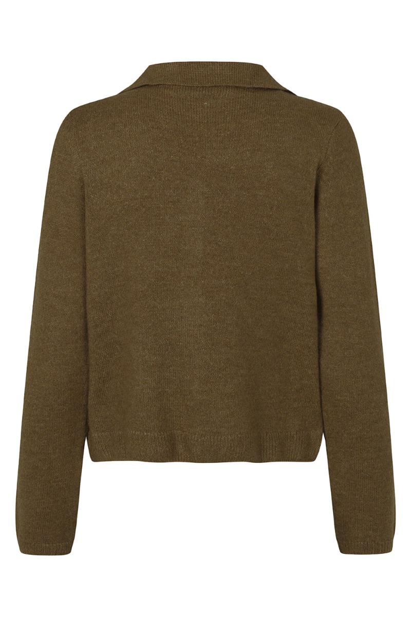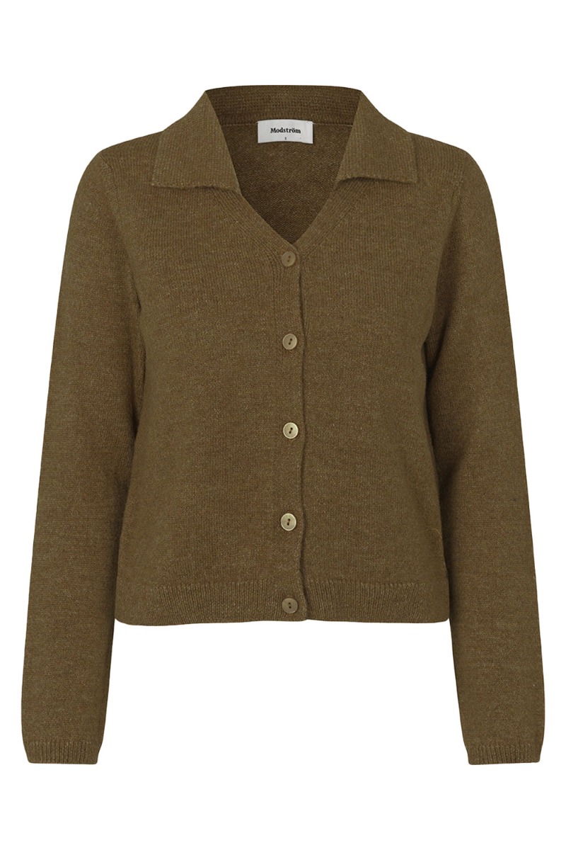 Skøn cardigan fra Modström i den lækreste brune efterårsfarve. Cardiganen er med knapper hele vejen ned og har en krave ved halsen som giver den en fin "skjorte" effekt.