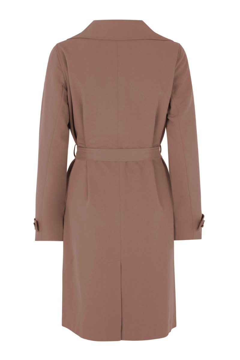 Smuk klassisk jakke fra Modström med bred krave og knaplukning foran. Jakken har bindebånd i livet der giver en smuk pasform. Den er perfekt som overgangsjakke og er rummelig.