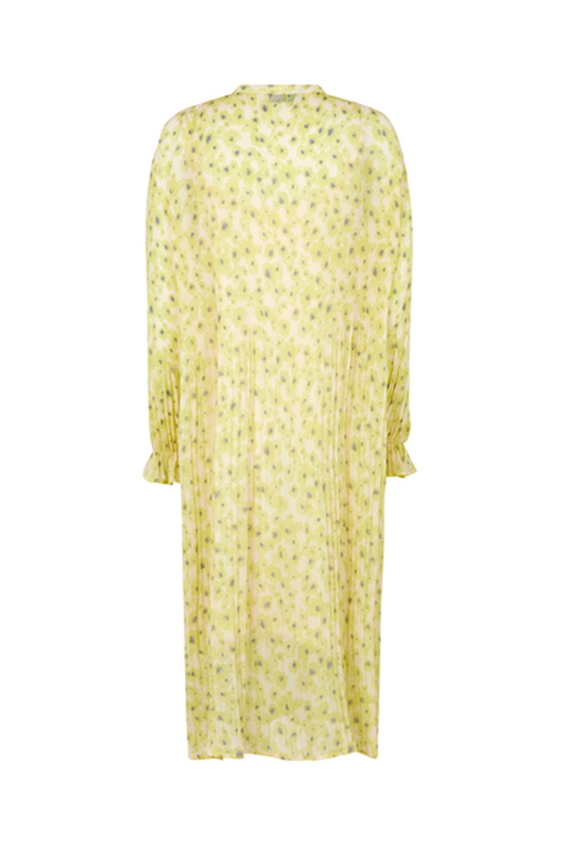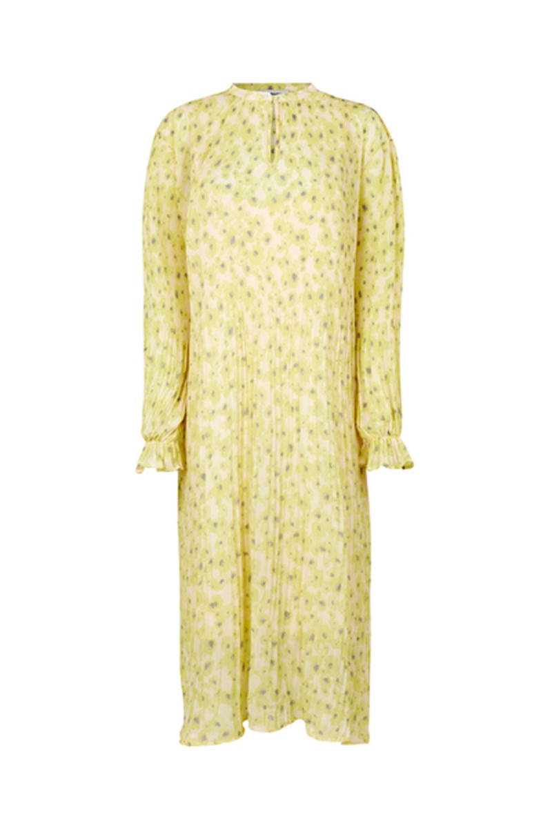 Smukkeste lysegule kjole fra Modström med blomsterprint. En rigtig LYKKE kjole som oser af de skønneste forårsvibes! Kjolen har en løst pasform med masser af rummelighed perfekt til en voksende babybule. Den har et yderfor som er plisseret og har en tilhørende underkjole. Den har lange løse ærmer med elastikkant i bunden som giver ærmet en flot flæsedetalje. Den har en enkel knappelukning foran ved halsen som giver en unik detalje. Styl den til forårets fester med en sandal eller en lille hæl.
