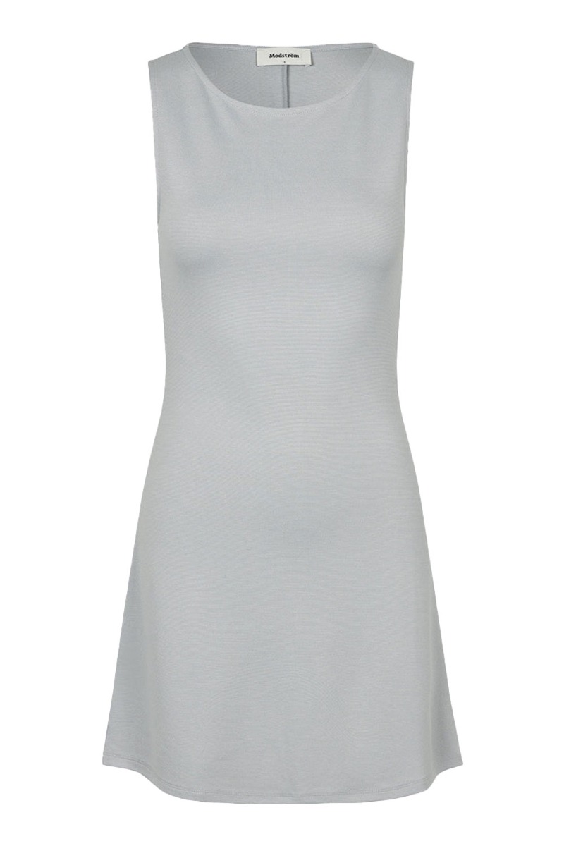 En fin og simple kjole fra Modström er kommet i denne sarte grå/blå farve. Den har en helt almindelig rund halsudskæring og ingen ærmer. Derudover er den med en smule A snit så den sidder løsere i bunden end i overdelen. Den er fin med en t-shirt eller en stram langærmert bluse under.