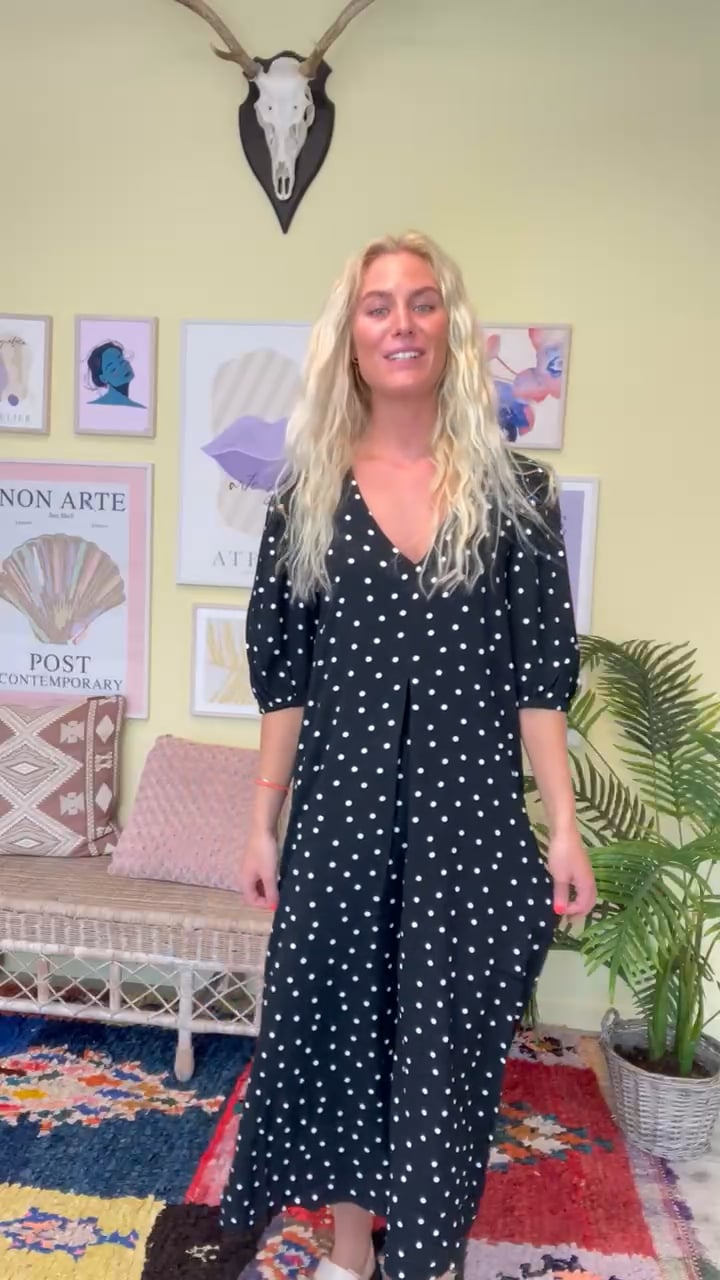 Vi ELSKER prikker hos Lykke by Lykke og derfor er denne Modström kjole helt sikkert en favorit! Kjolen har et flot fald langs kroppen i et løst a-snit der er behageligt og luftigt. Foran har kjolen et wienerlæg der giver en smuk detalje. De korte t-shirtærmer afsluttes med elastik i enden og giver et løst puffet look.