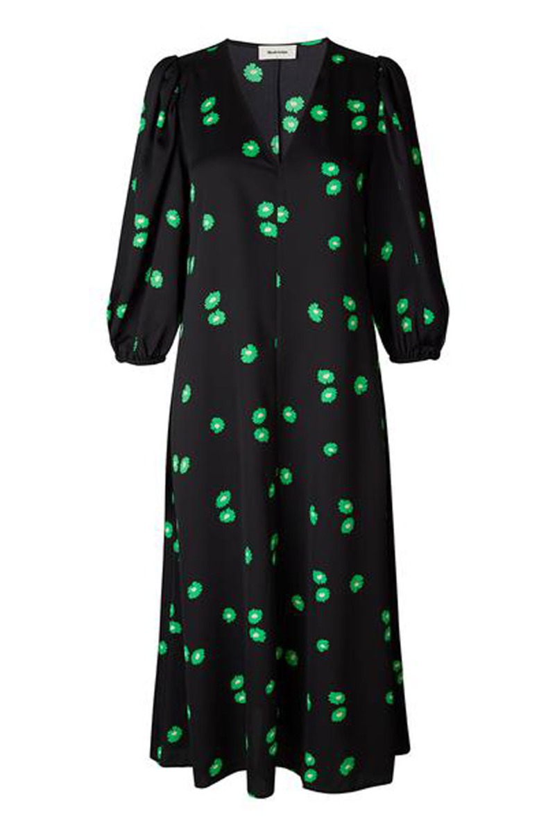 Feminin kjole fra Modström med grønne blomster på sort baggrund. Kjolen falder i et løst a-snit med v-udskæring foran og 3/4 ærmer. Style den til en stilet eller en rå støvle for at gøre den anvendelig både til fest og hverdag.