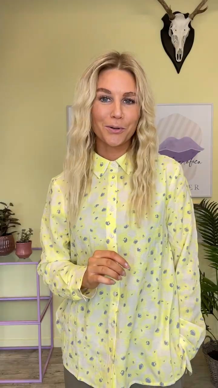 Smuk lysegul skjorte fra Modström. En løstsiddende skjorte med knapper hele vejen ned og en klassisk skjortekrave. Den har løse lange ærmer som bliver afsluttes med knappelukning. Den er designet i den fineste lysegule nuance og printet med et fint blålig blomsterprint.