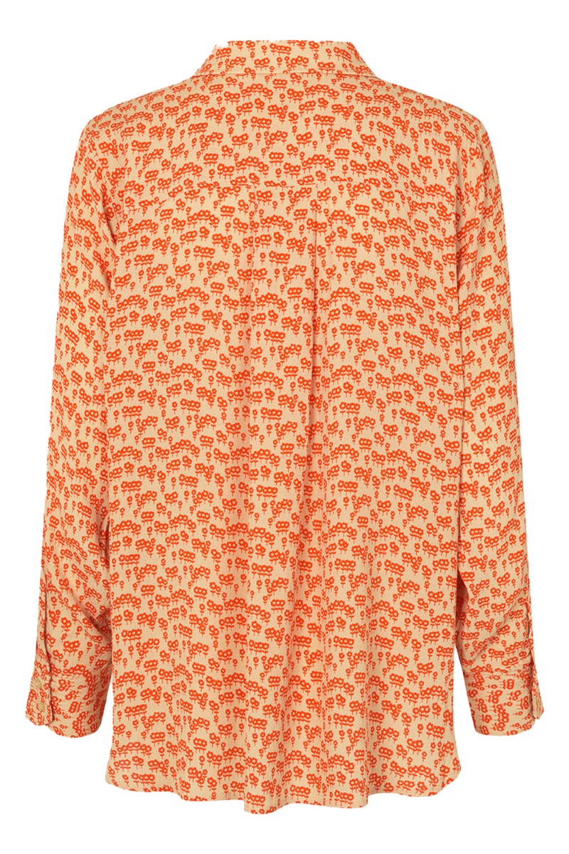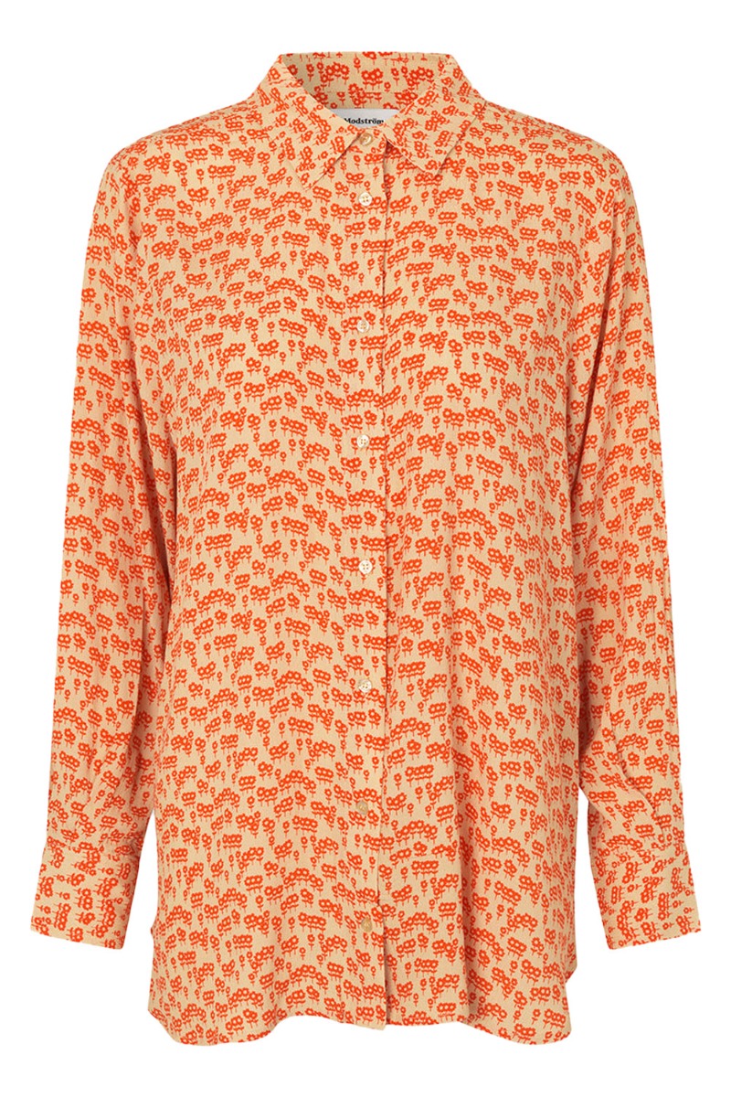 Det fineste print i en klassisk skjorte model fra Modström. Skjorten er lys orange med mørkere orange blomster print. Derudover er modellen helt klassisk med skjortekrave og synlige knapper hele vejen ned samt ved ærmerlukningen. Modellen er dog med ekstra længde så den er perfekt til et par jeans.