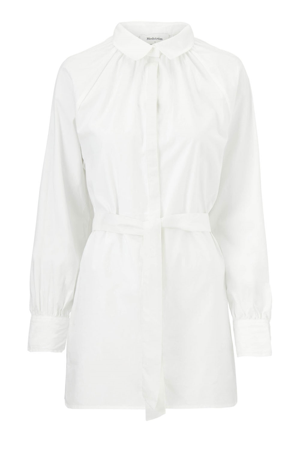 Klassisk hvid skjorte fra Modström med en elegant lille detalje. Skjorten er designet med bælte i livet, der nemlig giver en feminin talje som er med til at give et feminint udtryk. Skjorten lukkes foran med skjulte knapper hele vejen ned. Ærmerne har en bred manchet, der lukkes med tre knapper ved håndleddet. Style den både med og uden bælte for både at skabet et afslappet men feminint look.