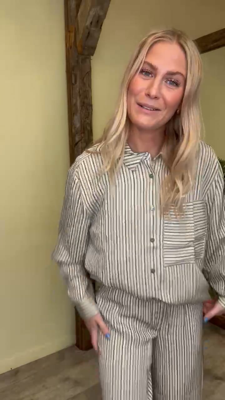En fin skjorte fra Modström er kommet med striber i grønne nuancer. Den er løs i pasformen og kan nemt styles til en nederdel eller et par shorts. Der findes et par matchende bukser. Den er let i kvaliteten og har klassisk skjortekrave.