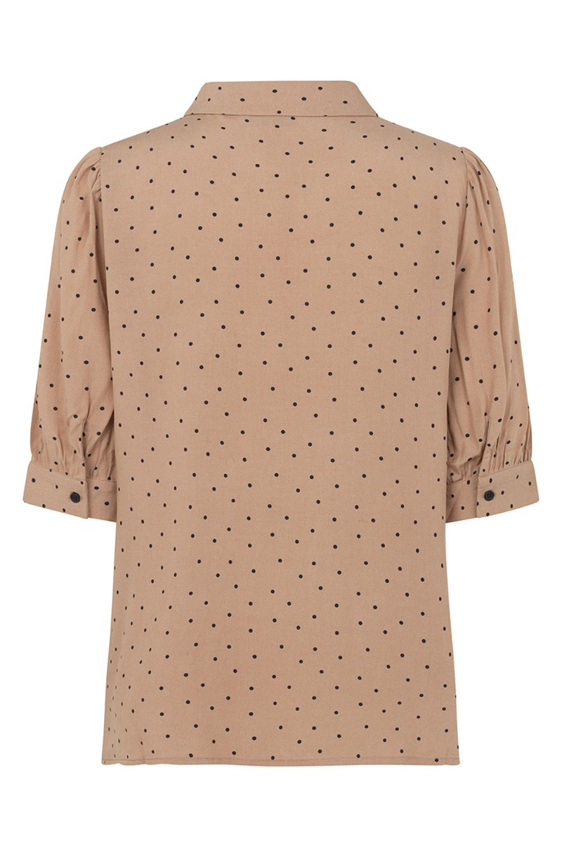 En rigtig sød skjorte fra Modström i camel farvet med små sorte polka prikker. Skjorten har et lille fint pufærme og klassisk skjortekrave foran der lukkes med knapper. Den er lavet i et helt let materiale der er utrolig behageligt at have på. Style den med de matchende bukser for et fuldendt look.
