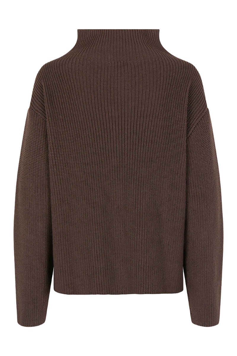 En smuk strik fra Modström er kommet i en flot mørk chokolade brun farve. Den er kraftig i strikken og har en lille turtleneck. Derudover er den løs i pasform og der kommer et matchende skørt. Den findes også i en smuk lilla farve. Men brun er helt klart en god efterårsfarve som kan bruges til flere sæsoner.