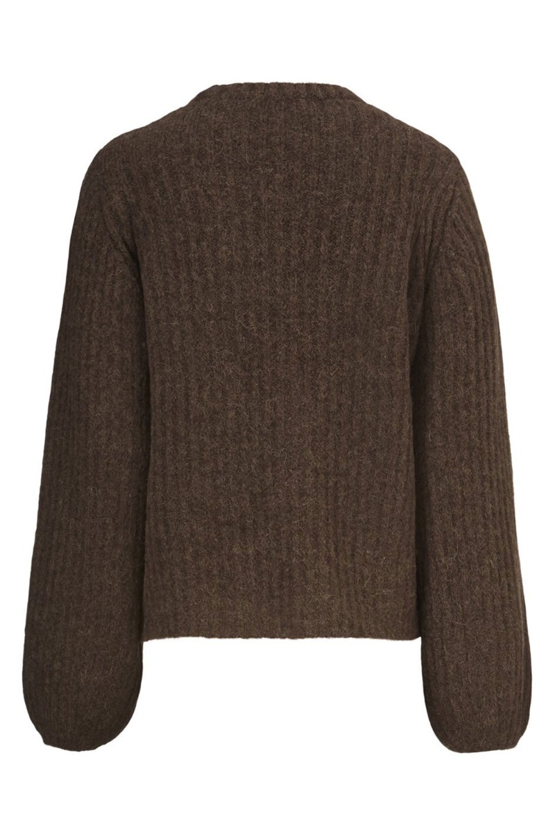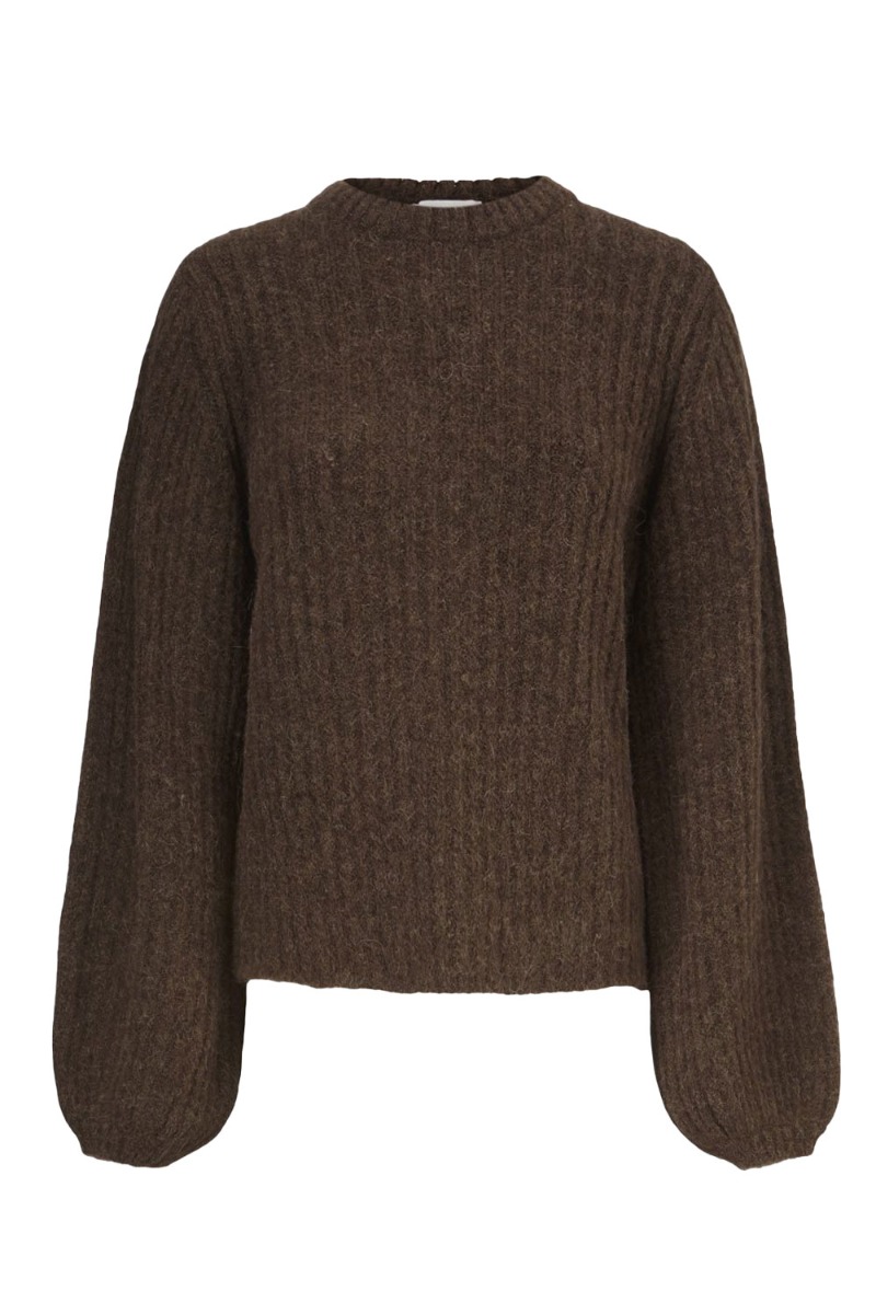Dejlig enkel strik fra Modström i brun. Strikken er løs med rund halsudskæring og lange ballonærmer der afsluttes med en tynd ribkant. Strikke er lavet i en skøn alpaka-blanding der gør den så dejlig at have på og giver et luksuriøst look.
