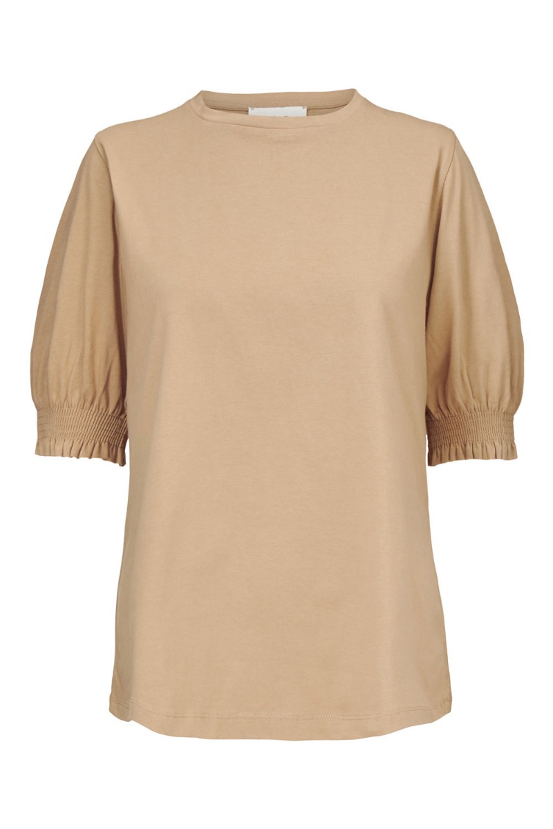 Sød klassisk t-shirt fra Modström i camel med feminine detaljer. T-shirten er med rund halsudskæring i et løst snit med de fineste pufærmer og smockeffekt ved kanten. Style en til et par jeans eller en sød nederdel.