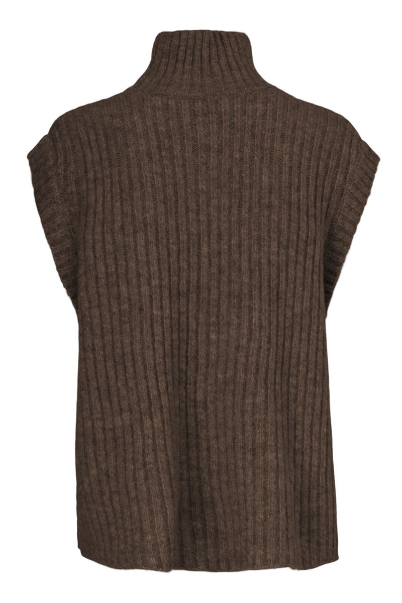Dejlig strikvest fra Modström i den smukkeste brune nuance. Vesten har høj hals med brede skuldre, der giver et super cool udtryk. Vesten holder dig varm hele vinteren og er perfekt over en t-shirt eller skjorte for at skabe et mere afslappet look.