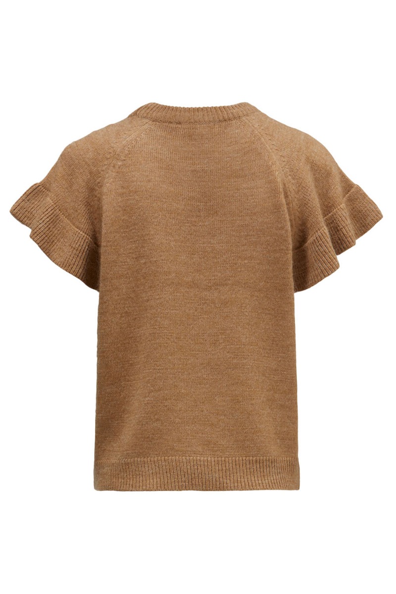 Skøn brun strikvest fra Modström der nemt kan bruges som en top på de lune forårsdage og hen i efteråret. Vesten har de fineste feminine flæseærmer og rund halsudskæring. Style den alene eller med en skjorte under.