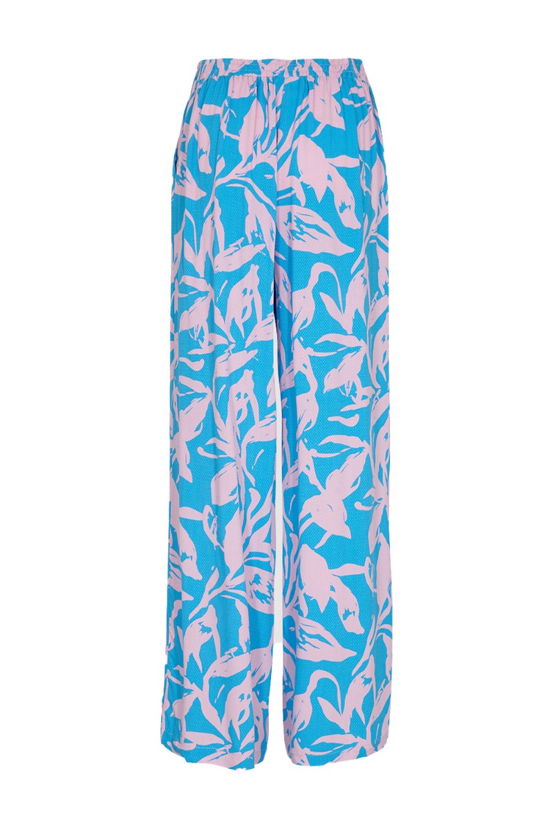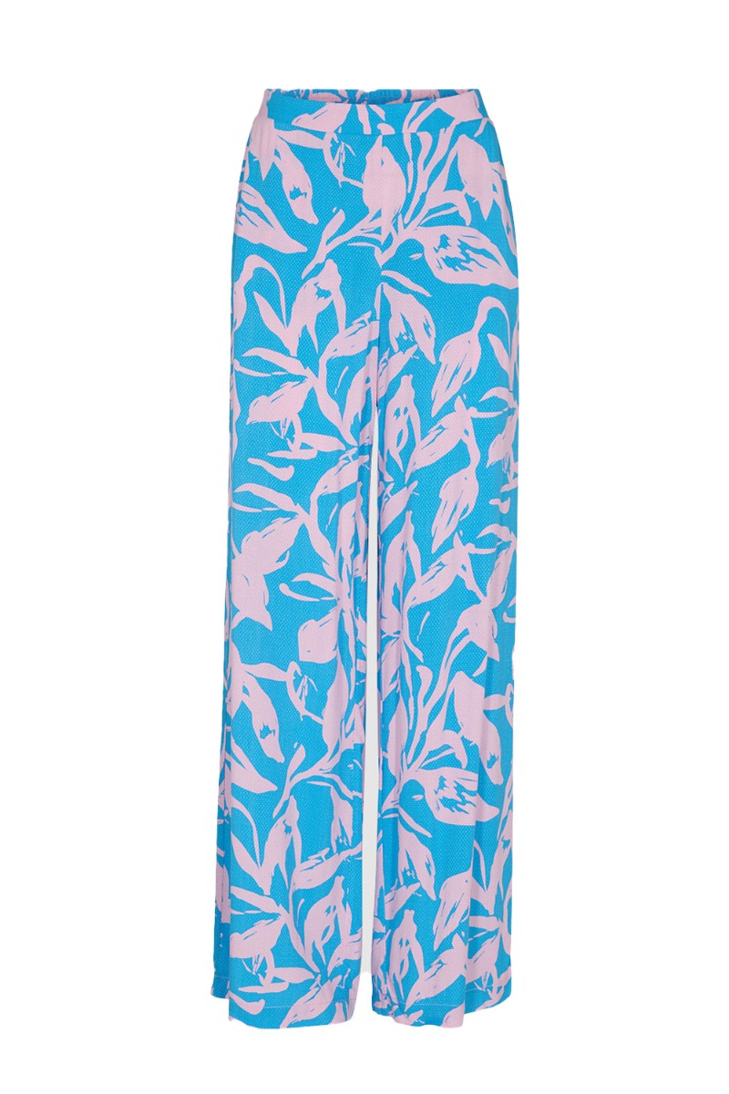 Wauw se lige det skønneste print fra Moves! Et par skønne løstsiddende bukser med elastik i taljen og lommer i begge sider. De er designet i et "vaflet" materiale som gør dem dejlig behagelige at have på. De er i en blå bundfarve med et skønt rosafarvet blomsterprint. For et fuldent look er det oplagt at style bukserne med den matchende skjorte.