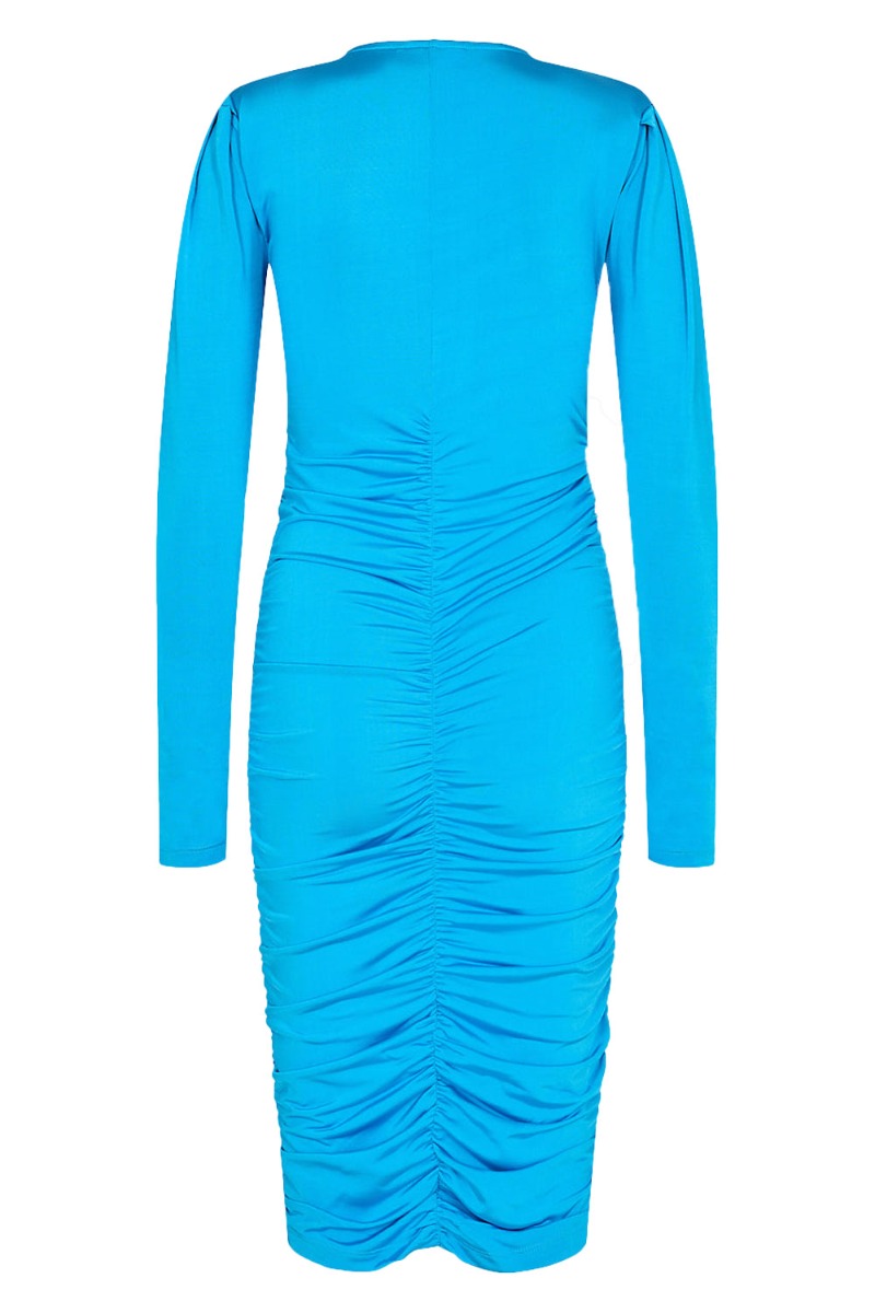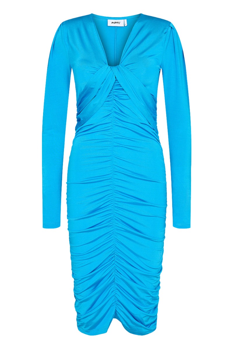 Smukkeste blå kjole der virkelig sidder som en drøm på. Kjolen er fra Moves i flot blå nuance med shineeffekt. Den er designet med rynkedetaljer, en åben halsudskæring og feminine folde detaljer på brystet. Style den med en stilet eller støvle alt efter anledning.