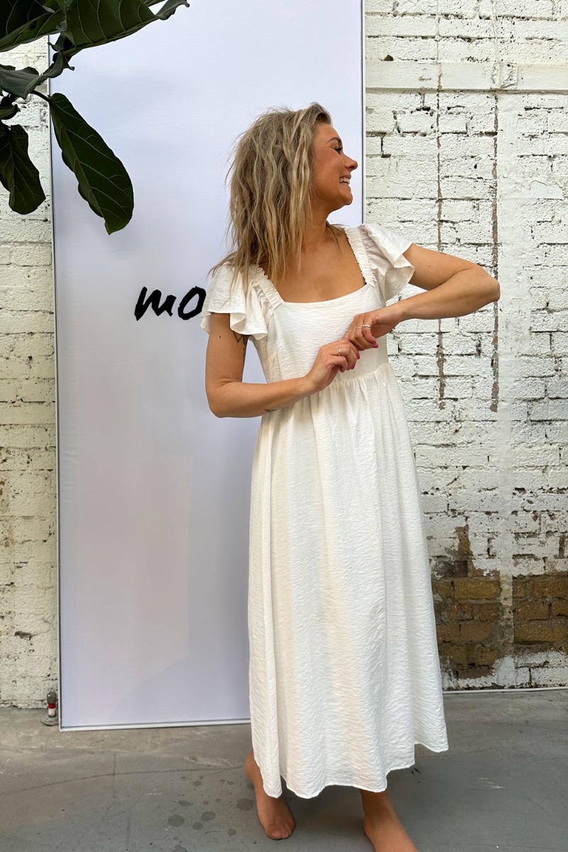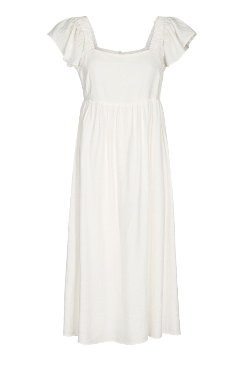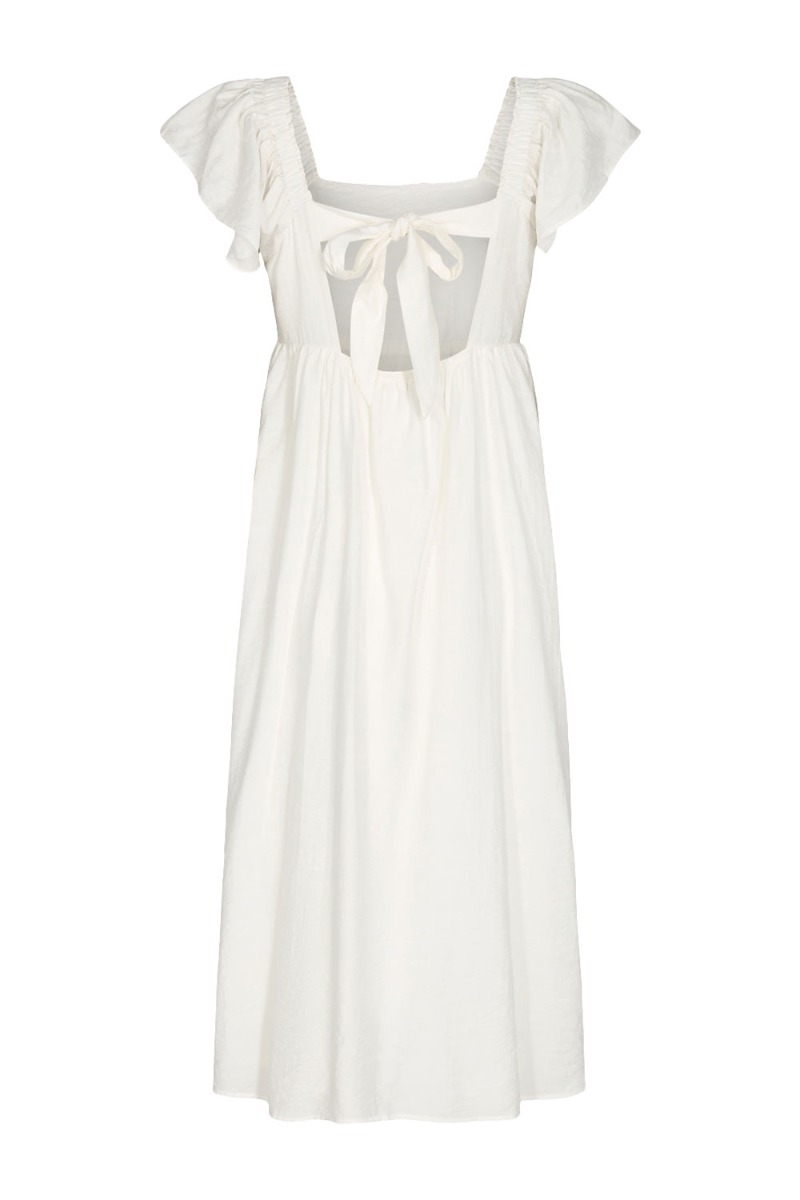Se lige den sødeste sommerkjole fra Moves!!! En skøn hvid sommerdrøm! Kjolen har et langt snit med korte flæseærmer. På ryggen har kjolen den fineste afslutning med en lille sløjfedetalje som gør den SUPER SMUK og feminim.