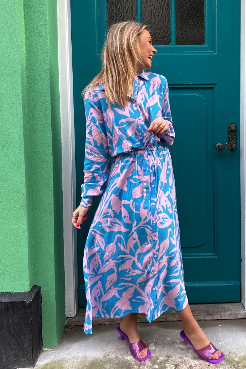 Wauw se lige det skønneste print fra Moves! En super sød og meget feminin kjole med knapper hele vejen ned og bindebånd i taljen. Den er i en smuk blå bundfarve og printet med et flot rosafarvet blomsterprint. Den har en løstsiddende pasform med lange løse ærmer. Den er både super ammevenlig og kan også bruges før, under og efter graviditeten! Styl den til en festlig anledning med en lille sød farverig stilet.
