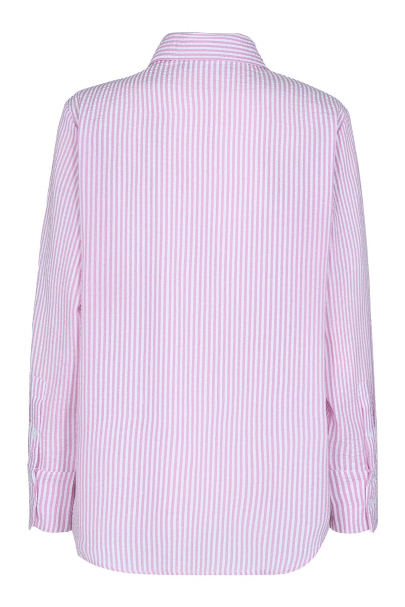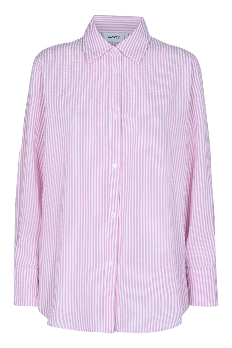 Løs skjorte fra Moves med matchende shorts i lyserød og hvid. Skjorten er rummelig med knapper ned foran og lange ærmer. Den er lavet i en dejlig blød crepet kvalitet der både er behagelig, afslappet og luftigt at have på.