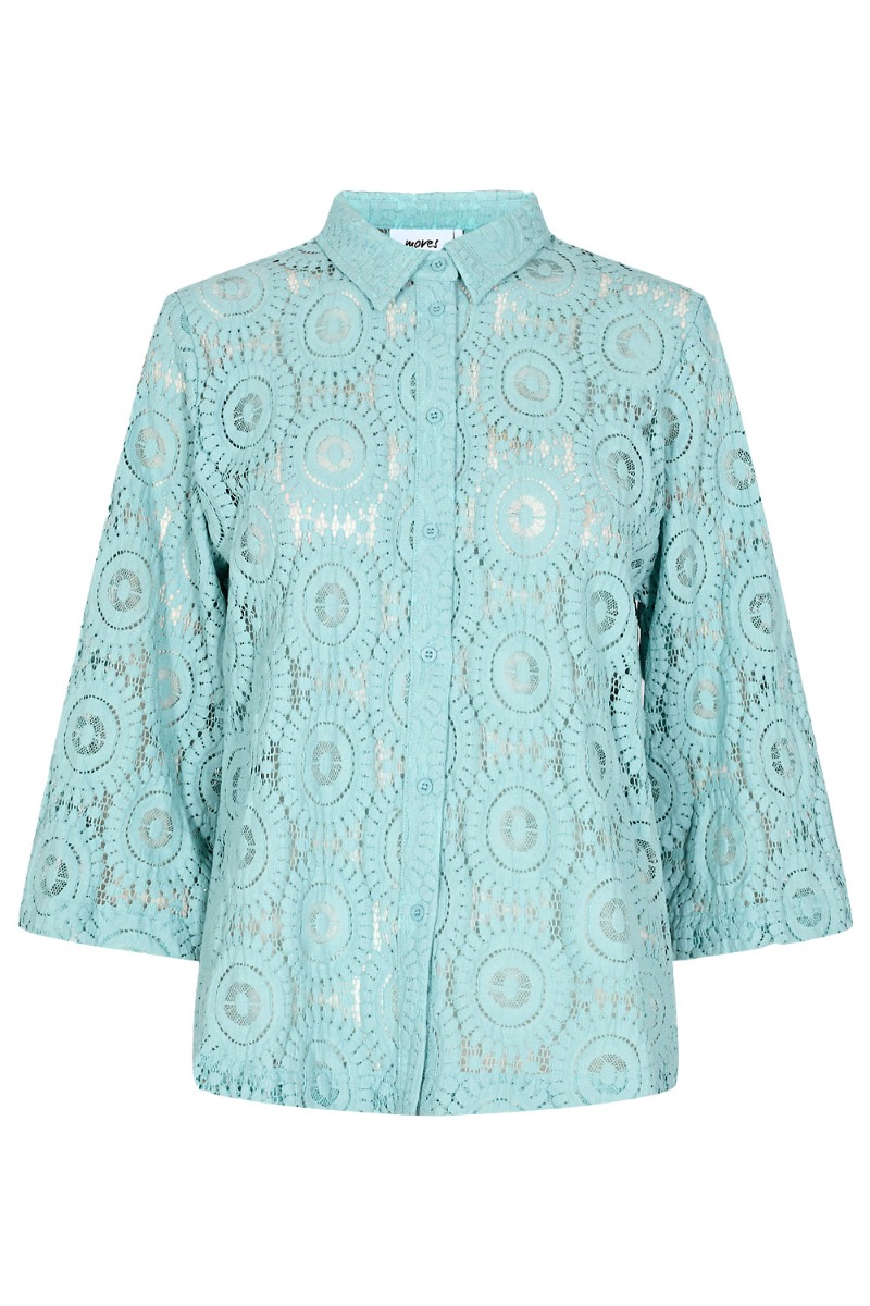 Skøn blonde skjorte fra Moves i en støvet blå nuance. Den har en rummelig pasform med løse 3/4 ærmer. Den har knapper ned langs skjorten og derfor designet i et ammevenligt snit. Den er transparent i materialet og derfor anbefaler vi at man styler med en basistop under. For et fuldendt look styl med de matchende bukser.