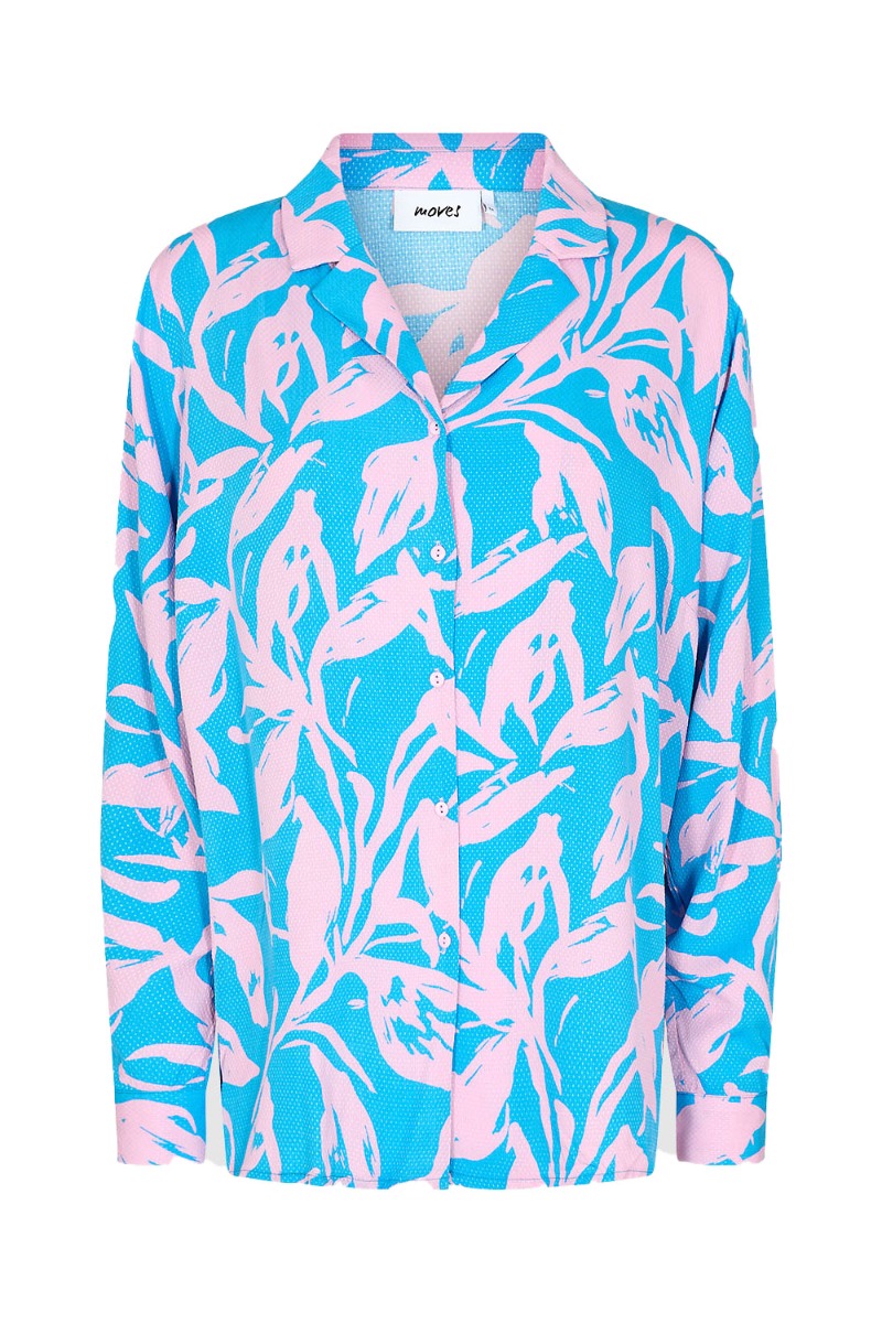 Wauw se lige det skønneste print fra Moves! En rummelig skjorte med blå bundfarve og med rosa blomsterprint. Skjorten har en rummelig pasform med lange ærmer og v-udskæring. Den er designet med små rosa knapper ned langs skjorten og derfor også i et super ammevenlig snit. Styl skjorten til de matchende bukser for et fuldendt look!