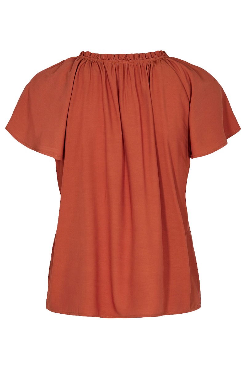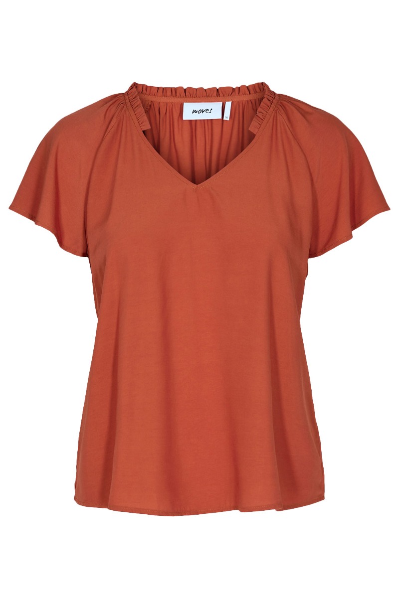 Skøn top fra Moves i en flot orangerød rust farve. Toppen har en løstsiddende pasform med v-udskæring og flæsekant langs kraven. Den har løse t-shirt ærmer og er super sød at style til et par lyse hørbukser eller en sød nederdel.