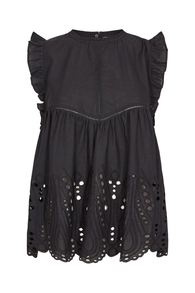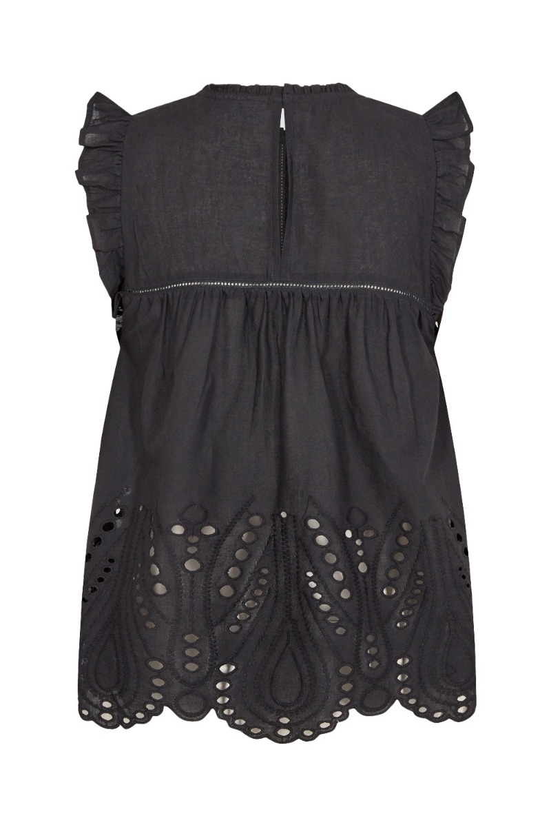 Ej se lige den sødeste sommertop fra Moves. I en sort klassisk nuance med flotte broderi anglaise detaljer. Den har en løstsiddende pasform med flæseærmer og bølgekant. Den lukkes i nakken med en lille knappedetalje. For et fuldendt sommerlook er det oplagt at style toppen med de matchende shorts.