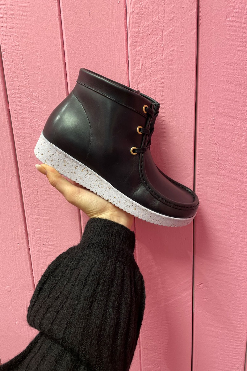 Vores klassiske EMMA sko fra Nature er kommet i helt sort med den velkendte hvide ergonomiske naturgummi sål med korkrester. Skoen har et lille skaft og snøres foran. De former sig efter dine fødder, fra første gang du hopper i dem og det er helt FANTASTISK! Style dem til efteråret.