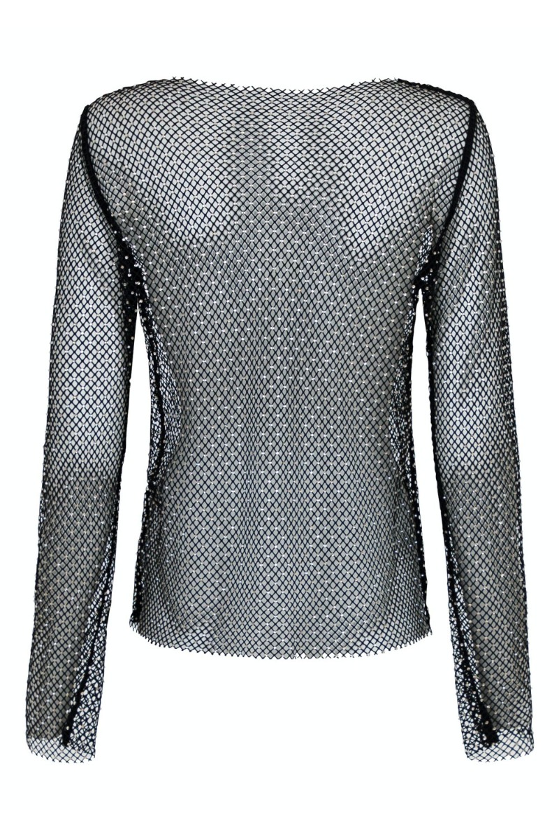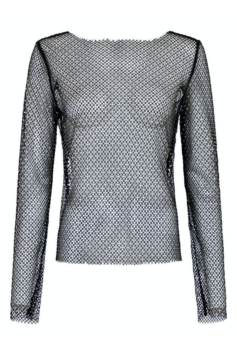 En sej bluse er kommet fra Neo Noir i denne net kvalitet med sten limet fast ved samlingerne. Den er helt gennemsigtig, derfor anbefaler vi at du bruger en top under. Den har lange er og båd halsudskæring. Derudover er den fin til en simpel nederdel til et festligt arrangement. Eller brug den med en blazer til hverdag.