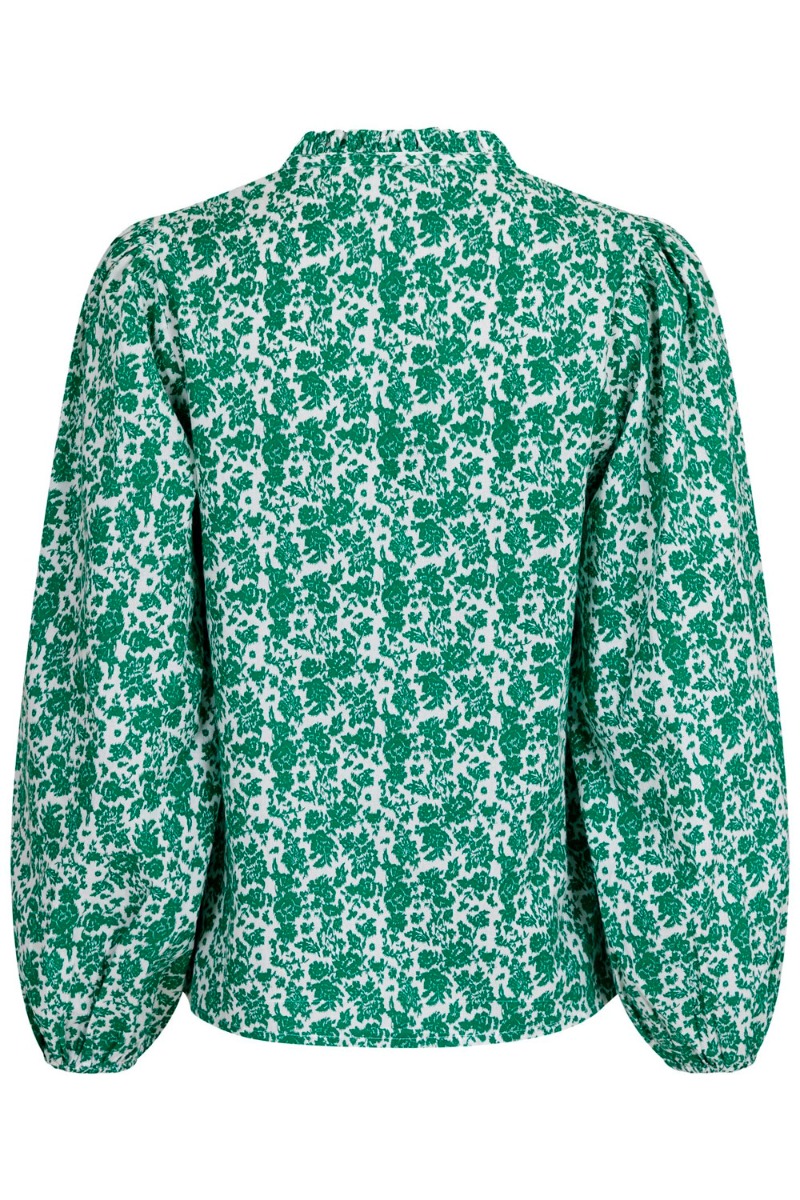 Sød feminin bluse fra Neo Noir i grønt blomsterprint. Den har et enkelt snit med en løs pasform og med fine flæsedetaljer ved halsudskæringen og halsen er dannet i en flot v-udskæring. Den har store volumiøse ærmer med elastikkant i bunden. Styl den til både hverdag og fest!