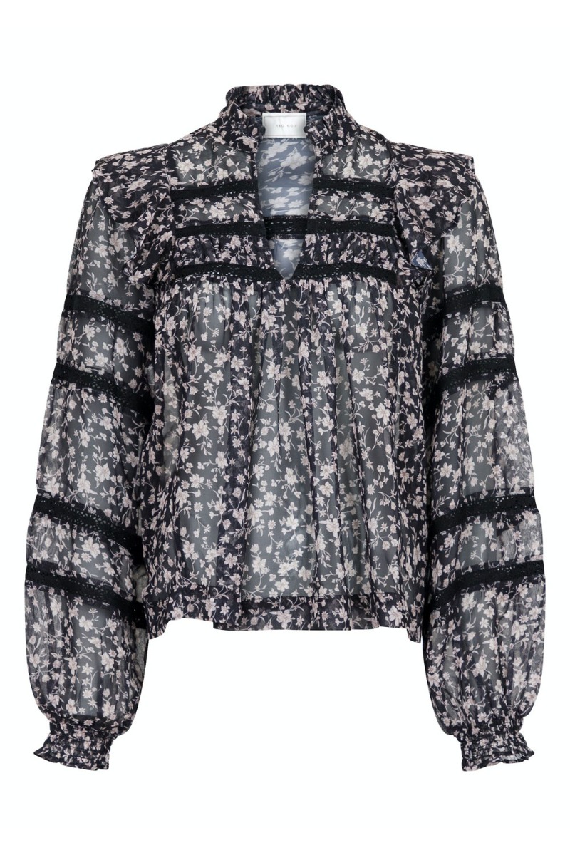 En smuk bluse fra Neo Noir i sort grundfarve med beige farvet blomsterprint. Den er med fine blonde detaljer og har flæser ved skulder og ved hals. Derudover afsluttes begge ærmer med en elastikkant som giver ærmet en smule balloneffekt og igen en lille flæsekant i bunden. Den er gennemsigtig og derfor anbefaler vi at du bruger en top under.