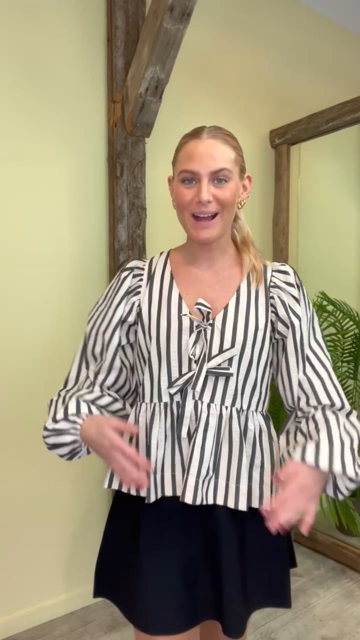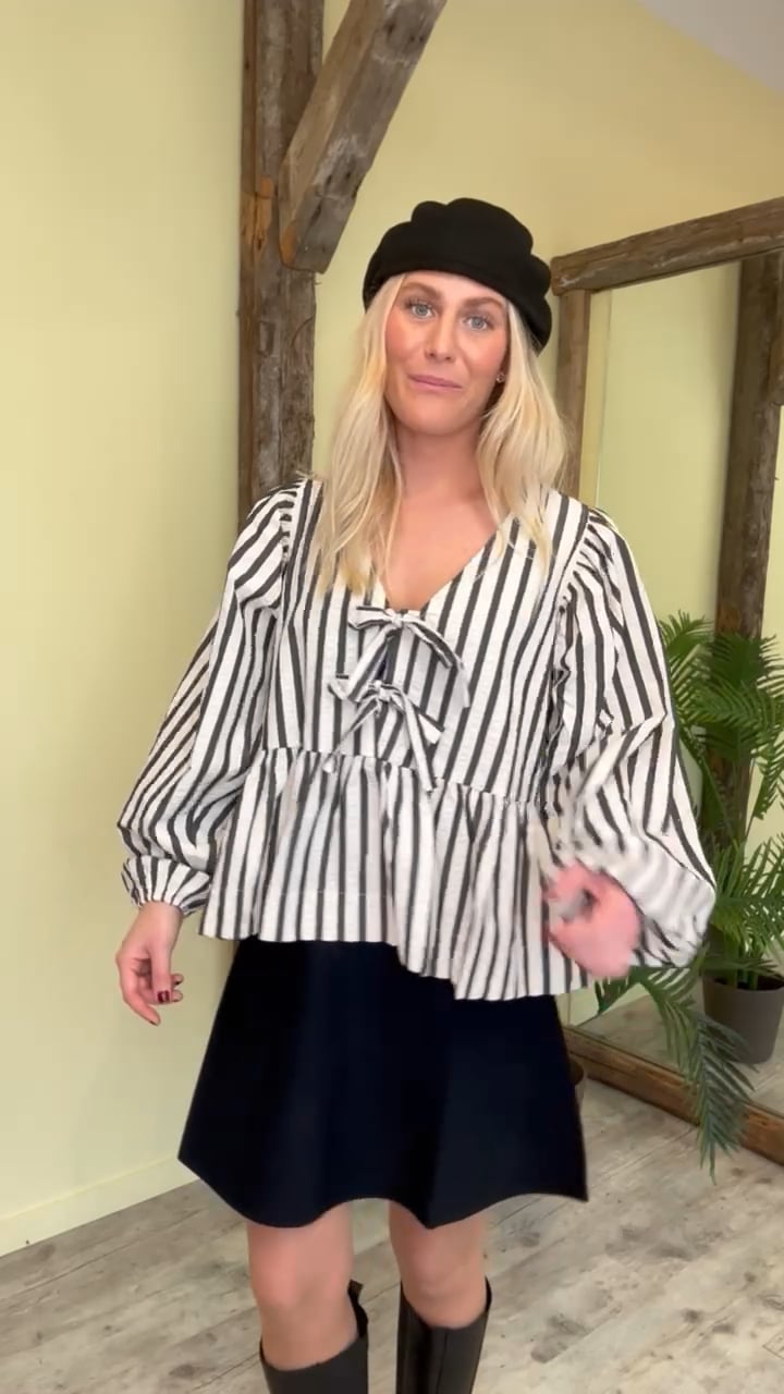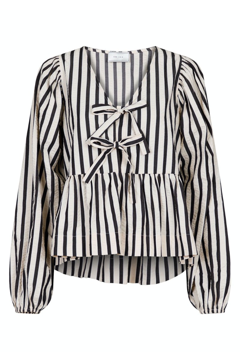 En sød bluse fra Neo Noir med striber i råhvid og sort farve. Den er løs i pasformen og har peplumeffekt i bunden. Derudover er der fine sløjfe detaljer foran, som også giver et feminint udtryk. Dette gør også at den er meget åben foran og man kan med fordel bruge en top under.