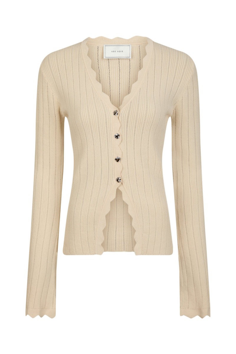 Den flotteste bluse fra Neo Noir! Denne bluse er i en tæt, men tynd rib/strik, som sætter sig super flot på kroppen. Den er lavet med en fin bølgekant og de flotteste bankede sølvknapper. Style den til et par jeans eller bukser!