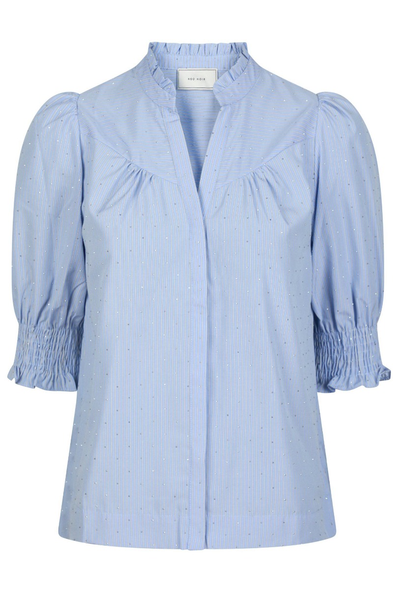 Kortærmet bluse fra Neo Noir. Denne bluse har feminine detaljer. Blusen har v-udskæring, smock for enden af ærmerne og søde små sten, som giver et mere festligt udtryk. Style den evt. til hverdag eller brug den til specielle anledninger, fx en fødselsdag.