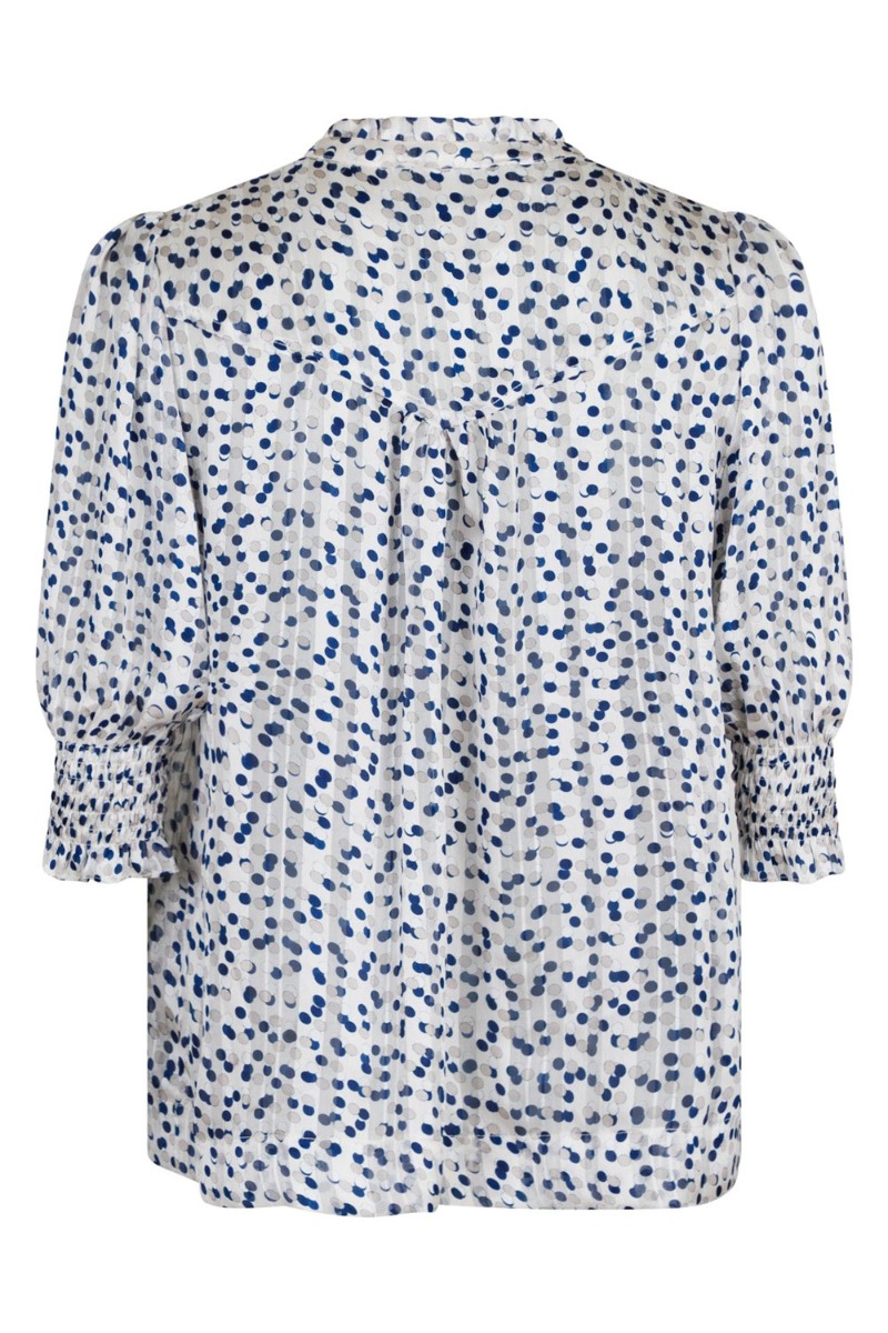 Feminin bluse fra Neo Noir i hvid med navy og beige prikker. Blusen er i en let tynd kvalitet der er en smule gennemsigtig. Den har skjulte knapper foran og t-shirtærme med smock i bunden. Style den til en pæn buks eller nederdel.