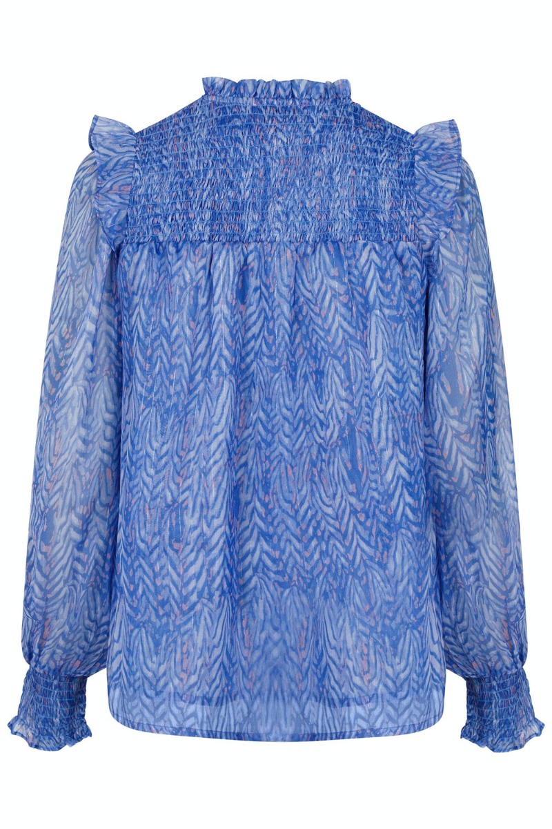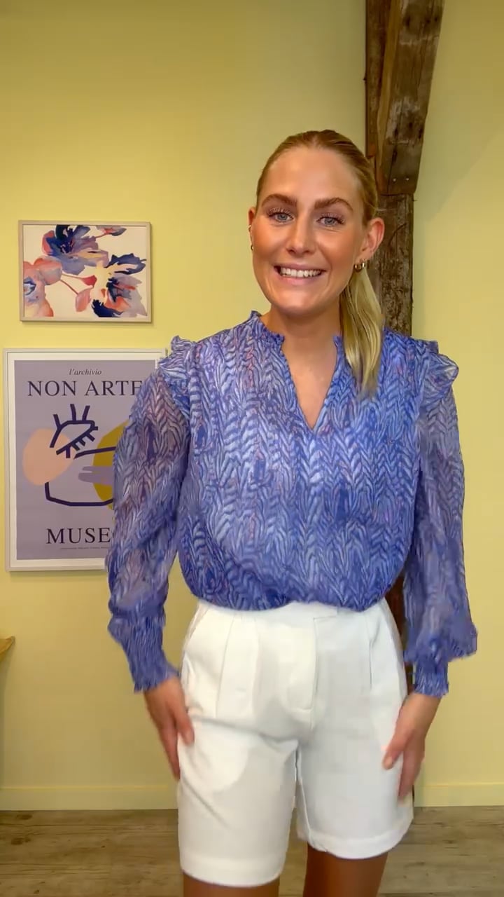 Neo Noir har lavet denne bluse med forskellige detaljer og farver - men vi må bare sige at det altid er en bluse der kan bruges uanset årstid. Denne er i blå nuancer, stadig med smock detalje ved ærmer og den fine V hals. Materialet er en anelse gennemsigtig, selvom der er dobbelt lag, derfor anbefaler vi at du bruger en basis top under.