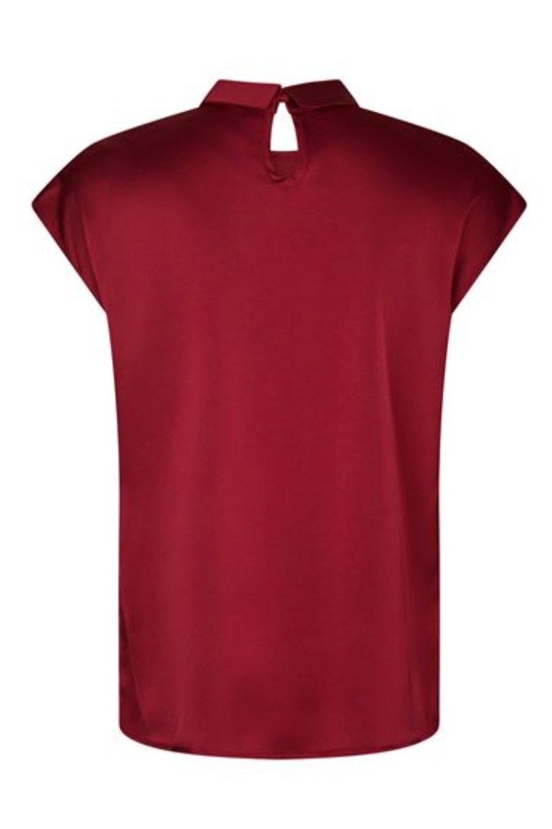 En smuk og elegant top fra Neo Noir er kommet i en vin røde farve i satin look. Den er løs i pasformen og derfor fint til en stram nederdel eller et par jeans. Den har knaplukning i nakken og et lille fold ved halsen samt en knude detalje også ved halsen.