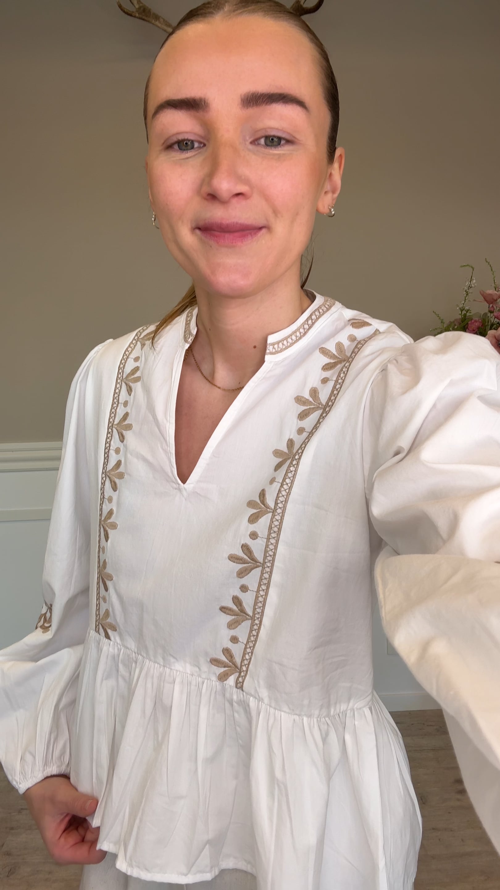 En virkelig sød bluse fra Neo Noir med de fineste broderede detaljer på! Denne bluse har pufærmer, en syning i livet, hvorfra stoffet breder sig ud og V-udskæring. Blusen er så fin til finere brug, men kan også sagtens styles til et par jeans og sneakers til hverdag!