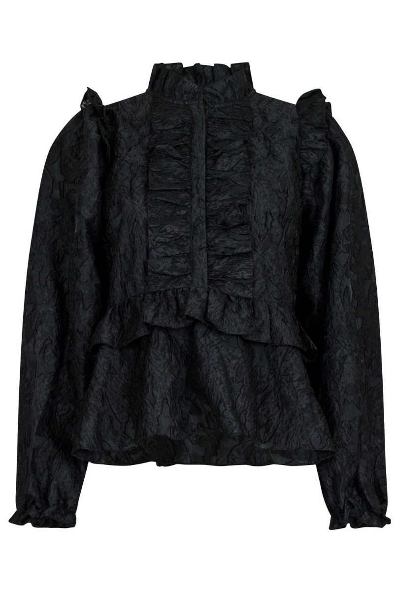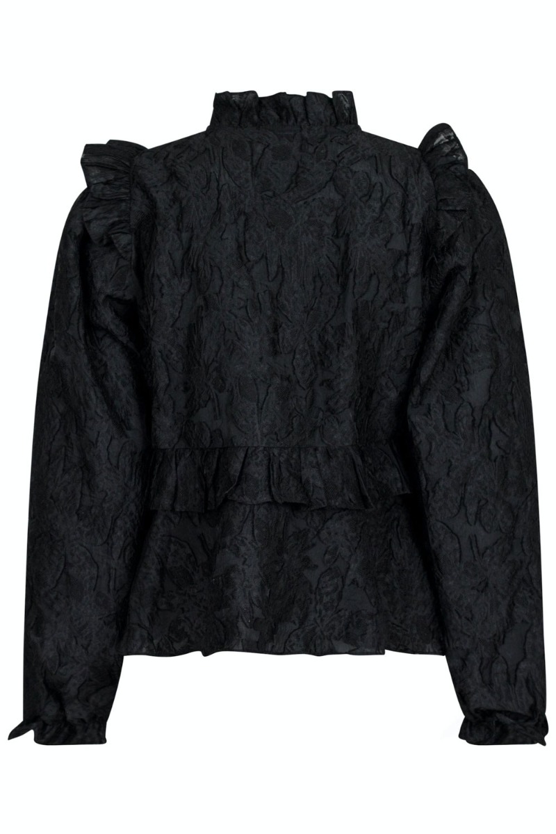 Neo Noir er bare god til at lave disse smukke og feminine bluser. Denne er sort med struktur i stoffet som giver et fint look til blusen. Den er med masser af flæsedetaljer over det hele og lukkes med knapper ned foran i taljen. Den passer fin sammen med hvilkens om helst underdel.