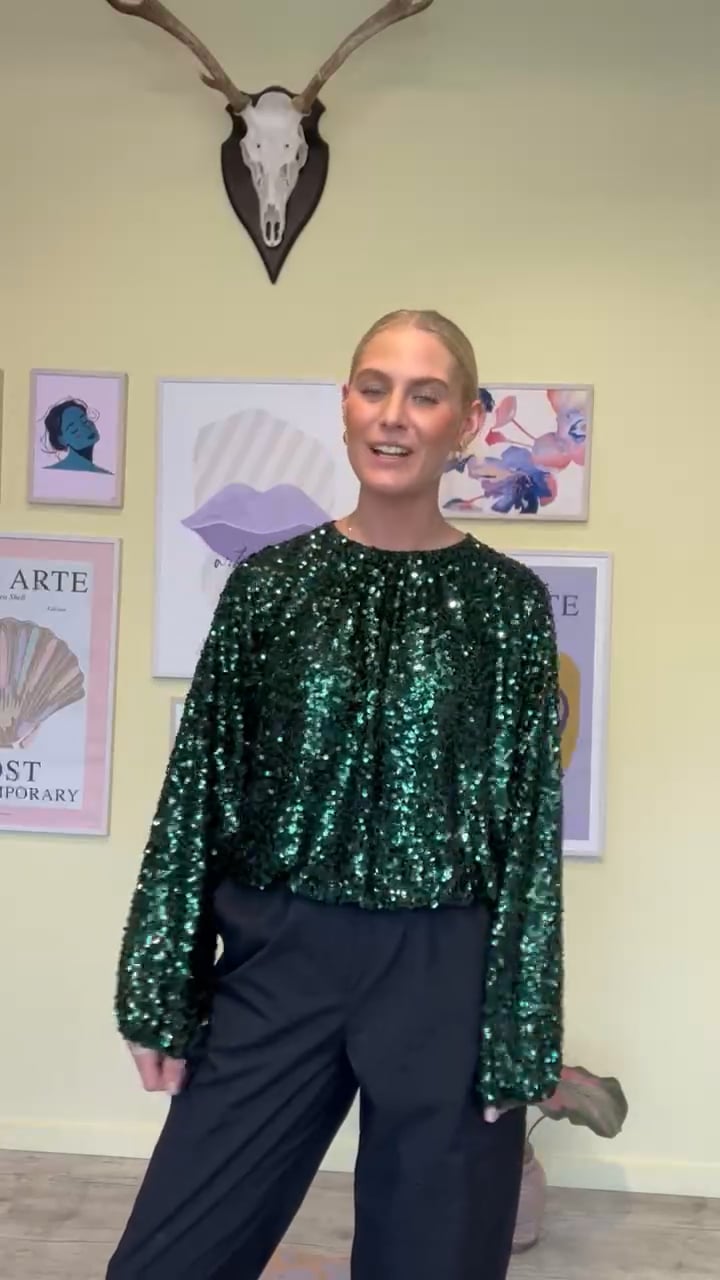 Paillet bluse fra Neo Noir i den flotteste grønne farve med matchende underdel. Blusen har et løst snit med lange ærmer. Blusen har skjult elastik i kanten der skaber et fint ballonsnit. Den runde halsudskæring lukkes med en enkelt knaplukning i nakken der giver en lille åbning.