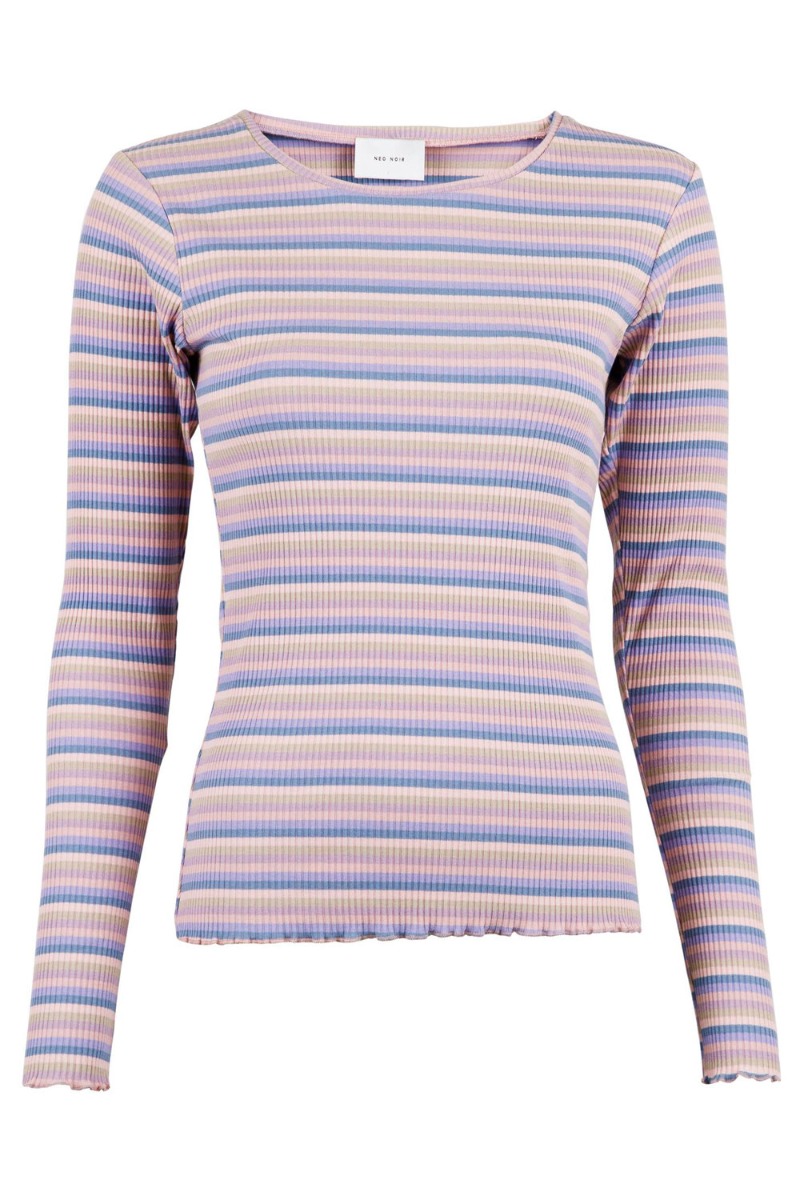 Lækker ribbet bluse fra Neo Noir i stribet nuancer. Blusen er med masser af stræk og afsluttes med den sødeste lille bølgekant ved ærme og bund. Style den til de matchende bukser for et rigtig hyggesæt og smid en blazer over når du skal ud og mødes med veninderne.