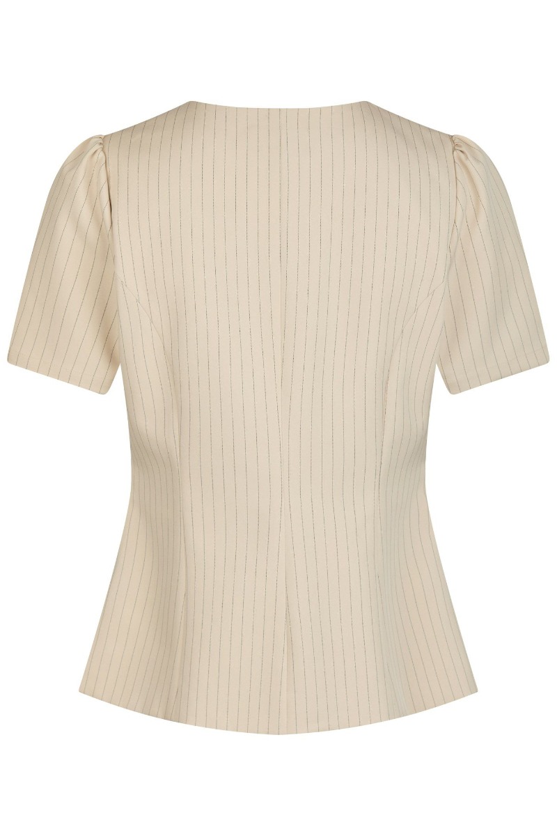 Bluse fra Neo Noir. Denne bluse har korte ærmer, v-udskæring og brune knapper til at lukke med foran. Den er let figursyet og sidder derfor en smule mere ind i taljen. Blusen har den fineste sandfarvet baggrund med mørke striber.