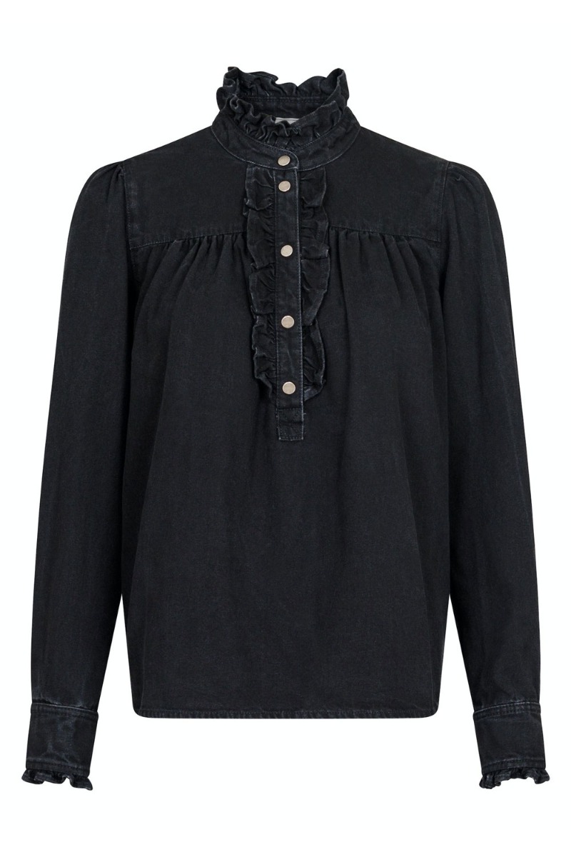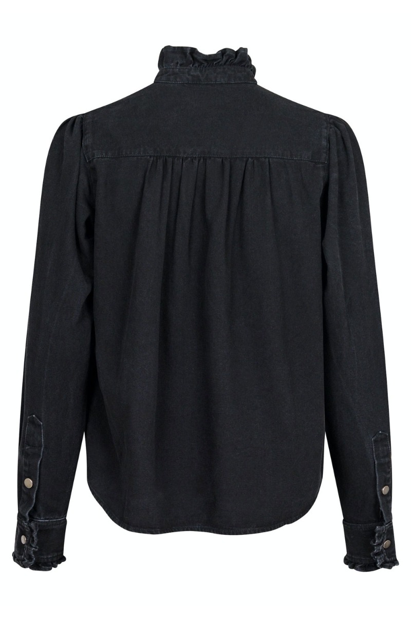 En fin bluse fra Neo Noir er kommet i en sort denim kvalitet. Den er fast i stoffet og også kraftig, så den giver et råt udtryk til dit outfit. Den er med fine feminine flæse detaæjer ved bryst, hals og ærmer. Derudover lukkes den med trukknapper foran halvt ned ved brystet. Den er fin til et hverdags look med et par jeans eller til en par habit bukser.