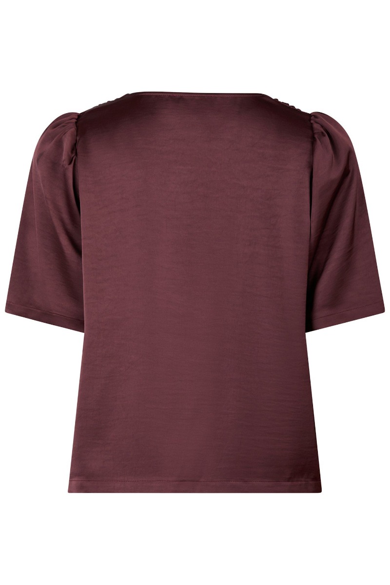 Så fin en bluse fra Neo Noir i en satin lignende kvalitet, som falder rigtig flot og samtidig er super behagelig at have på. Blusen er i den flotteste burgundy nuance og går ned i et v-snit ved halsen. Derudover er der lavet en lille rynkedetalje ved skuldrene som gør at den får et lille pufærme.