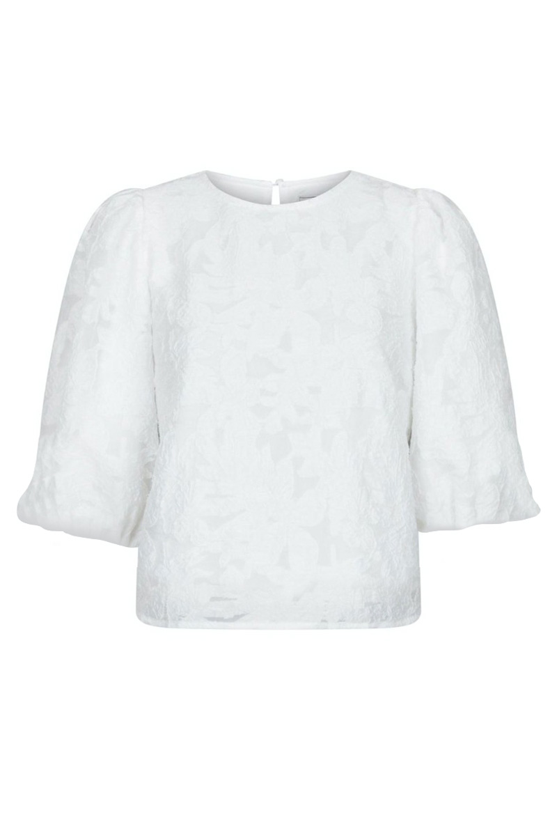 Den fineste bluse fra Neo Noir i hvidt stof med struktur. Den er med 2/4 lange ærmer som er med en smule puf effekt. Den er i to lag så den heller ikke gennemsigtig samt med en simpel knapdetalje i nakken. Den er fin til en nederdel eller med et par jeans til.