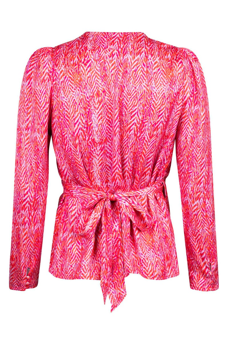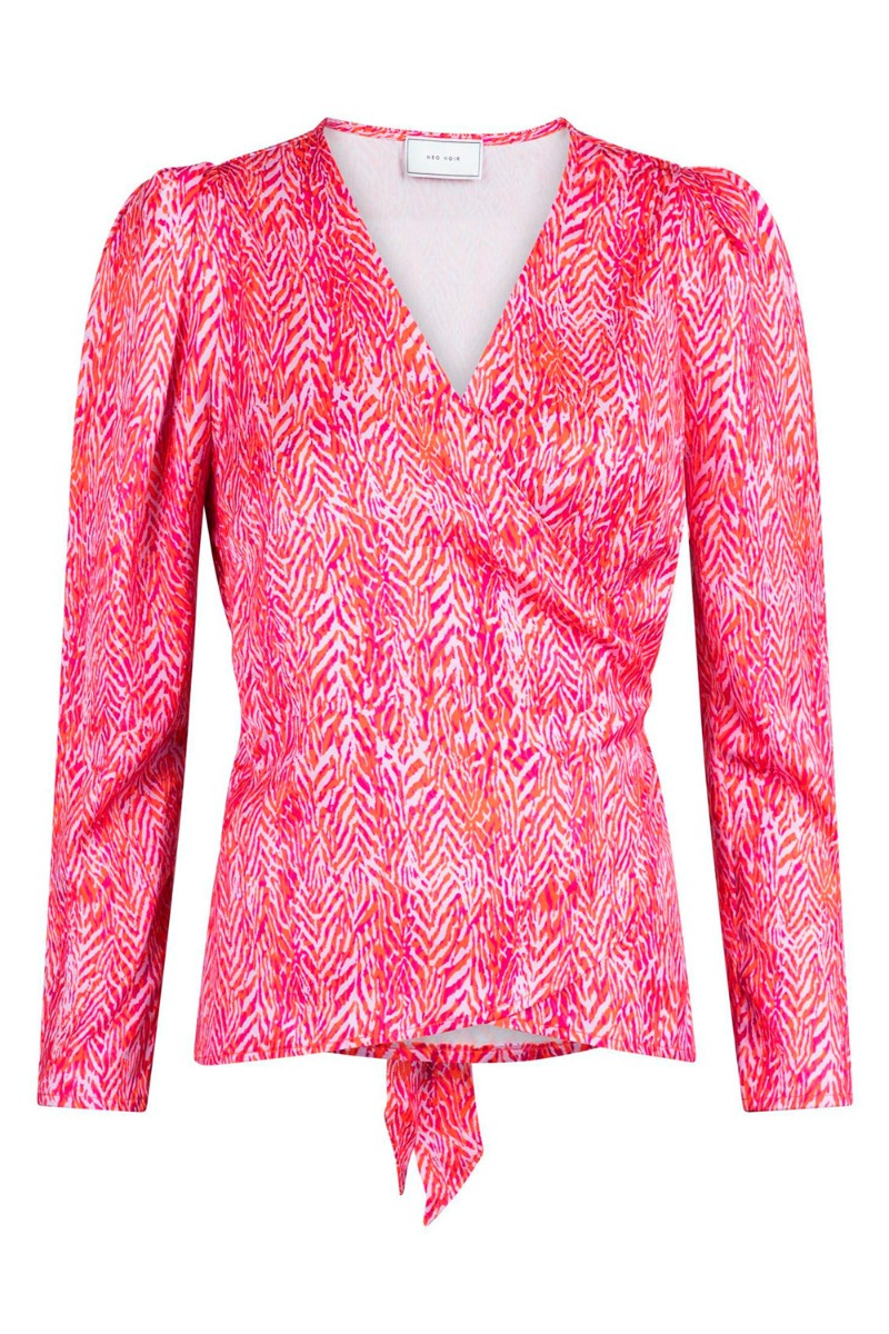 Feminin slå-om-bluse fra Neo Noir i det fineste satin materiale med det smukkeste print i orange, pink og lilla nuancer. Blusen bindes i siden eller bagtil alt efter eget ønske og har en lille skulderpude samt rynkeeffekt der giver en smuk feminin detalje. Style den med en "pæn" buks til festlig anledning.
