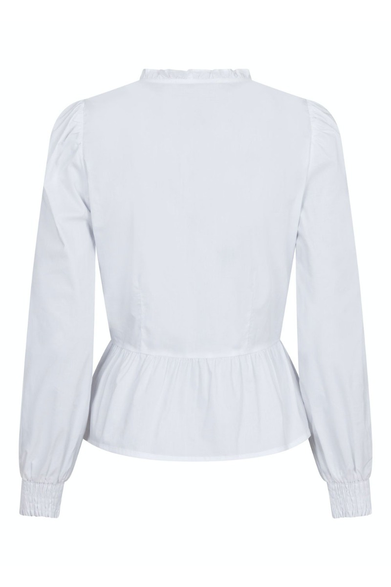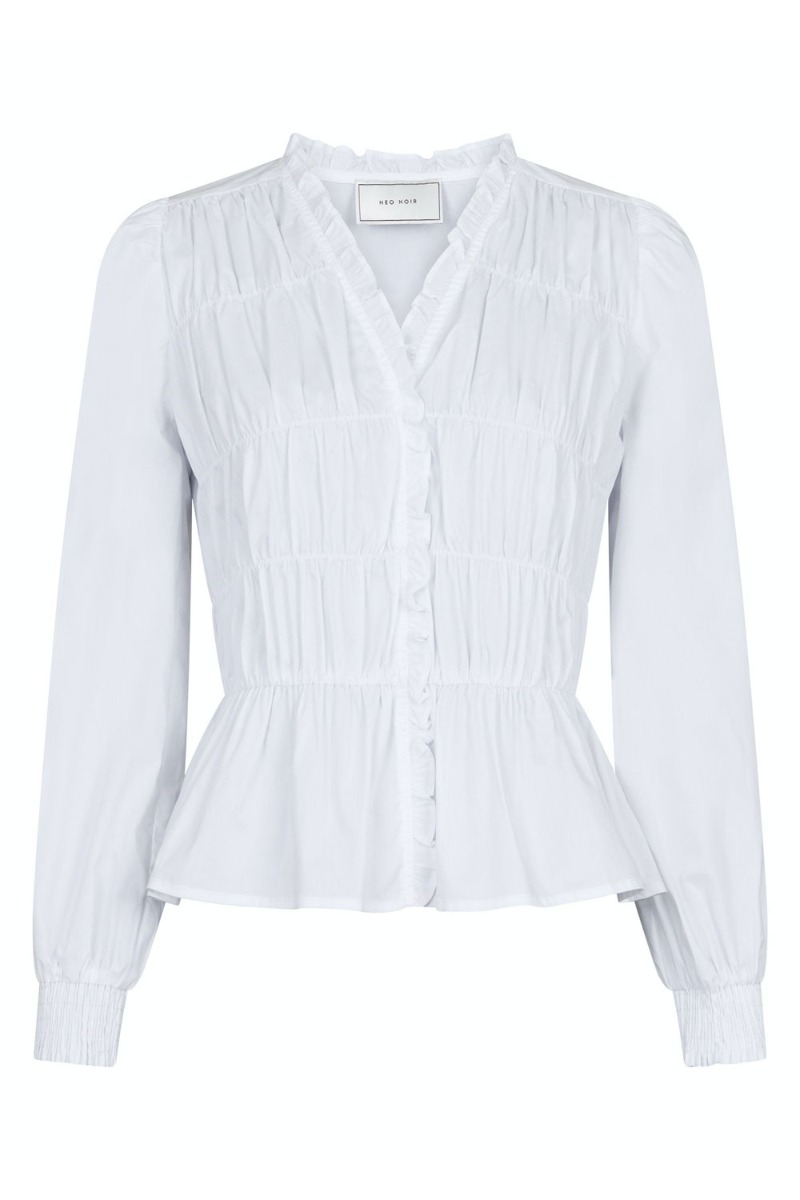 En fin feminin bluse i hvid fra Neo Noir er landet til denne sæson. Hvid kan man altid bruge og derfor er den god til garderoben. Den er med elastik detaljer ved kroppen i flere lag og har smukke flæsekanter ved hals og i midten. Derudover er kvaliteten dejlig let og kan bruges under en blazer eller til en strik.