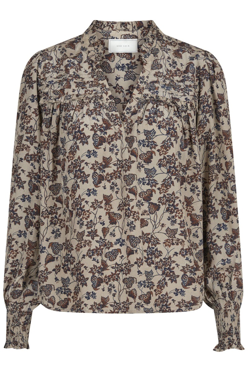 Feminin bluse fra Neo Noir. Denne bluse har de fineste farvekombinationer i jordfarvet nuancer. Blusen har v-udskæring og smock ved håndled. Den har en let kvalitet og en behagelig pasform, som er nem at style både til hverdag og særlige anledninger.