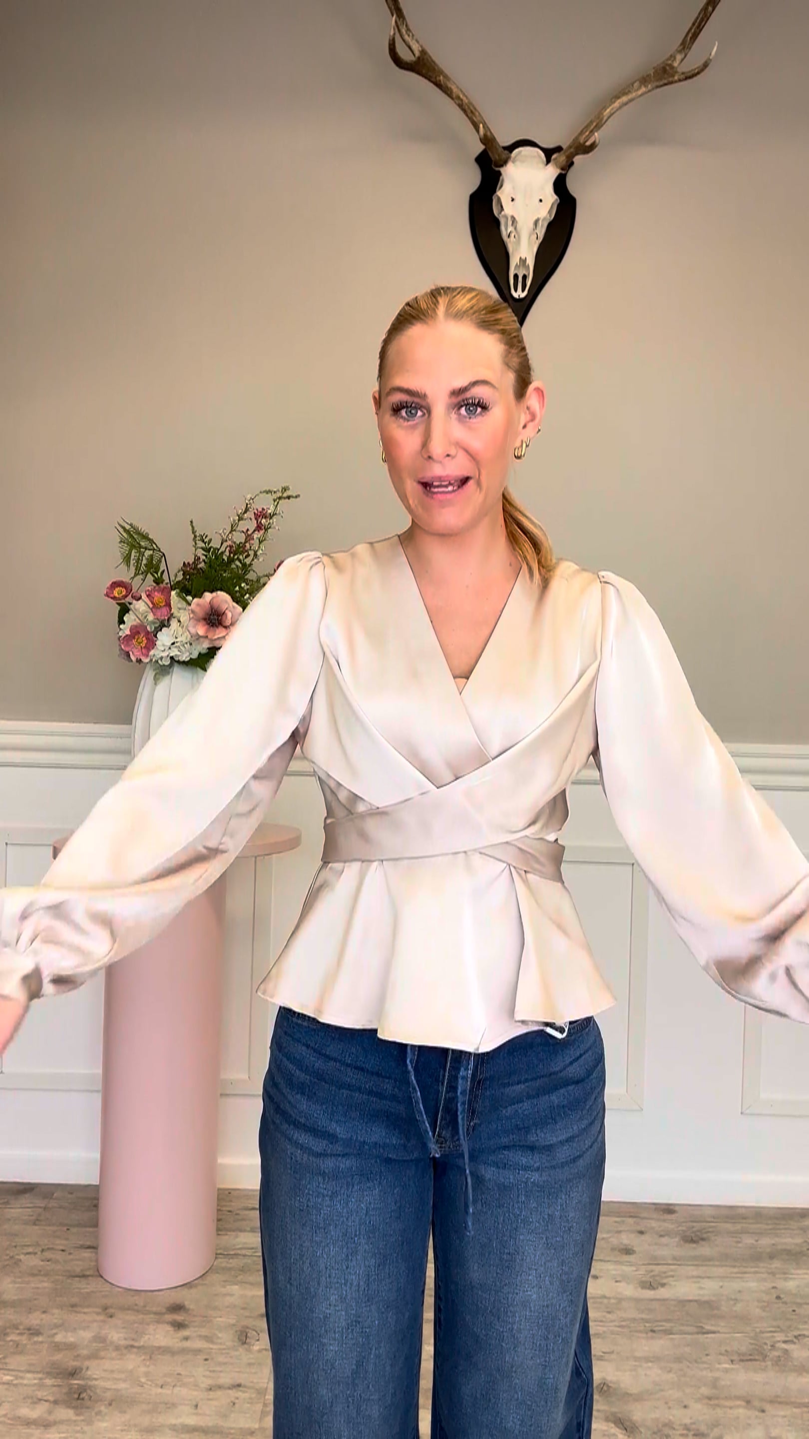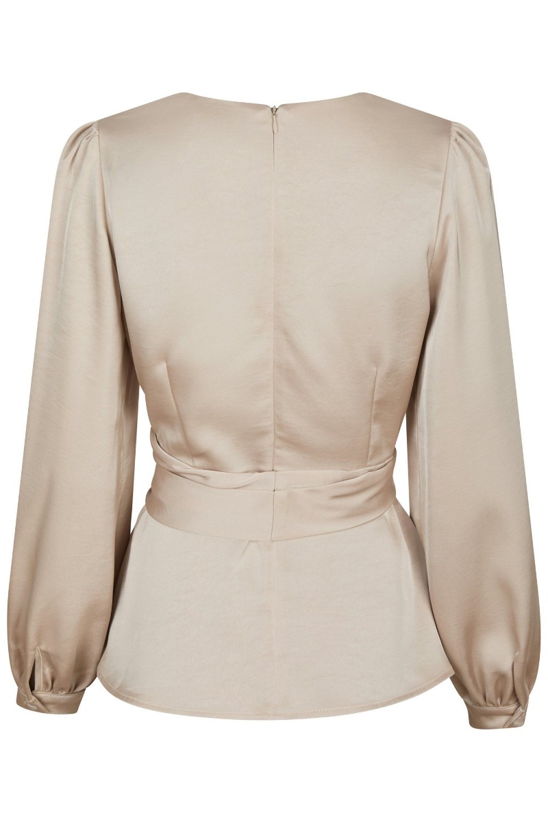 En utroligt smuk og elegant bluse fra Neo Noir i den flotteste champagnefarve. Bluse sidder super smukt med sit fine snit. Den har bindebånd i livet og et flot slå-om design. Denne Bluse er helt perfekt til enhver festlig anledning!